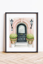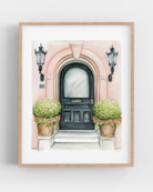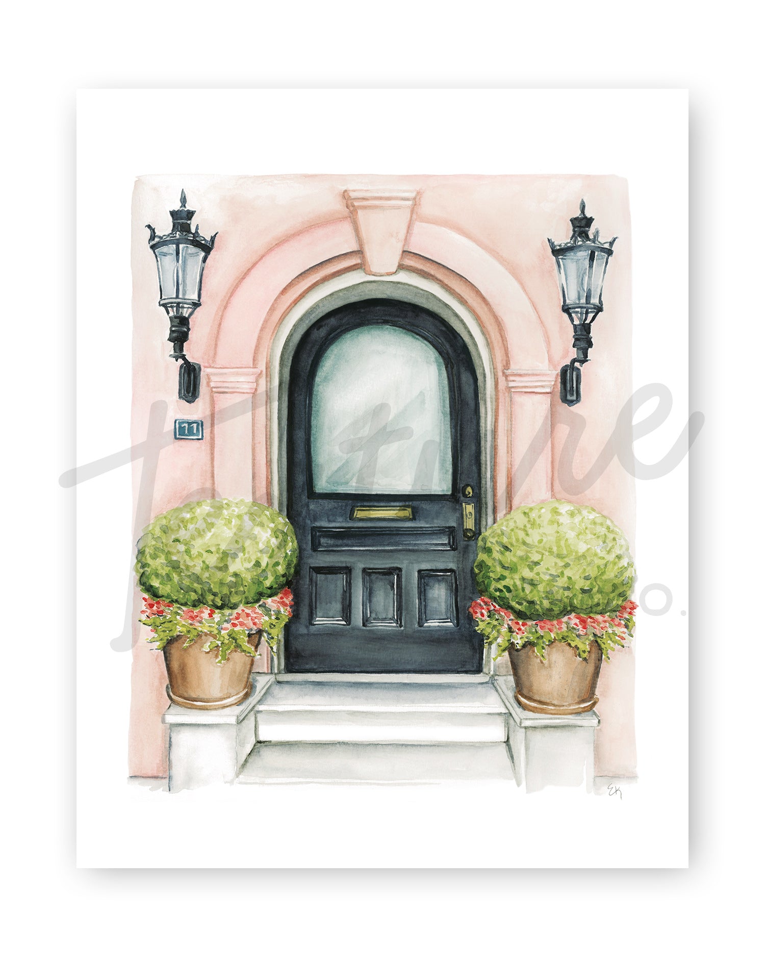 Inspired by the architectural design of the Lowcountry, the art print showcases an intricately detailed timeless front door from Charleston, SC. The black arched door stands out against the pale clay print of the home.