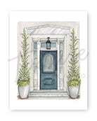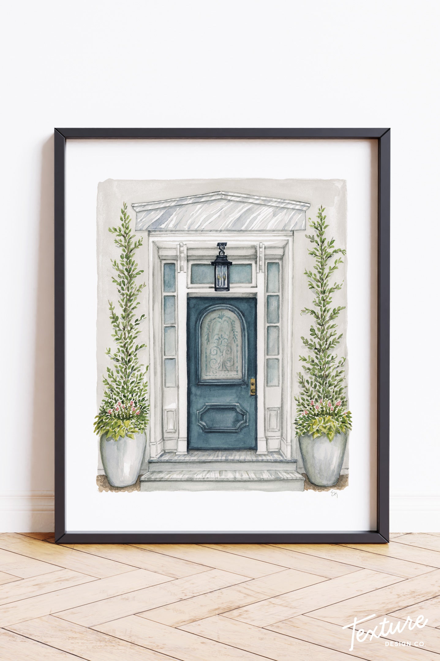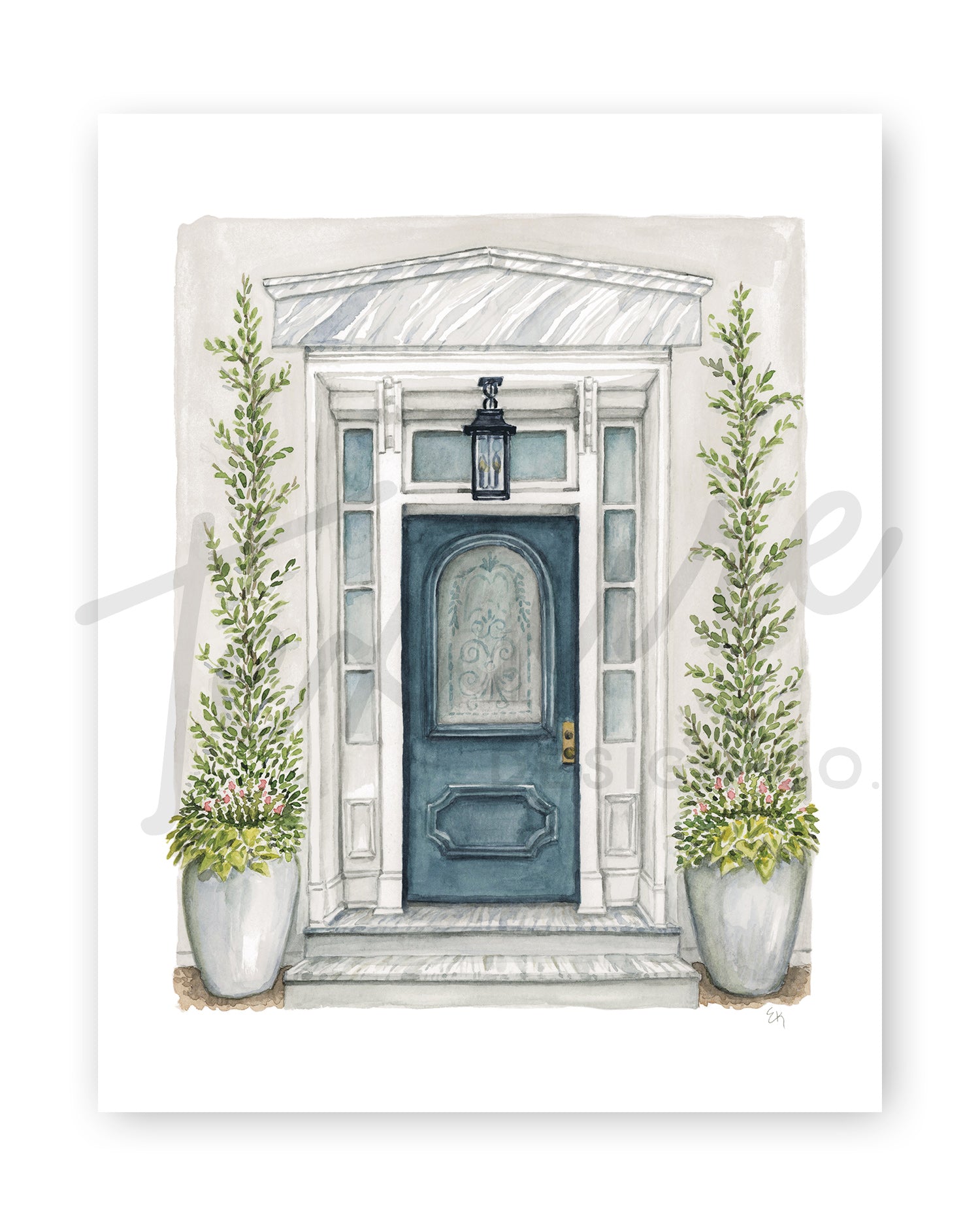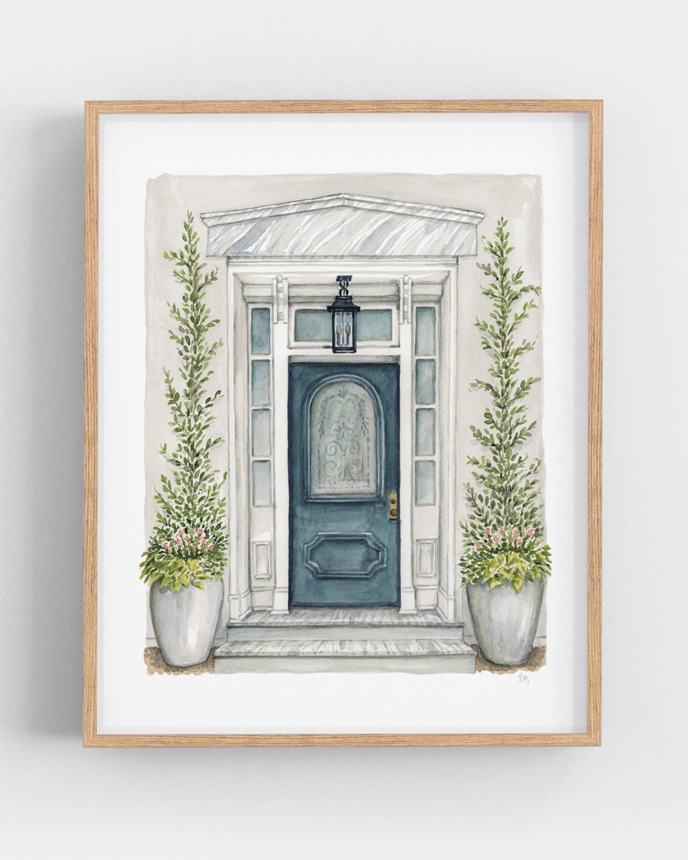 Inspired by the architectural design of the Lowcountry, the art print showcases an intricately detailed timeless front door from Charleston, SC. The icy blue door features an intricate glass design and timeless transom windows. The door is framed by two trellis plants and overflowing modern planters.