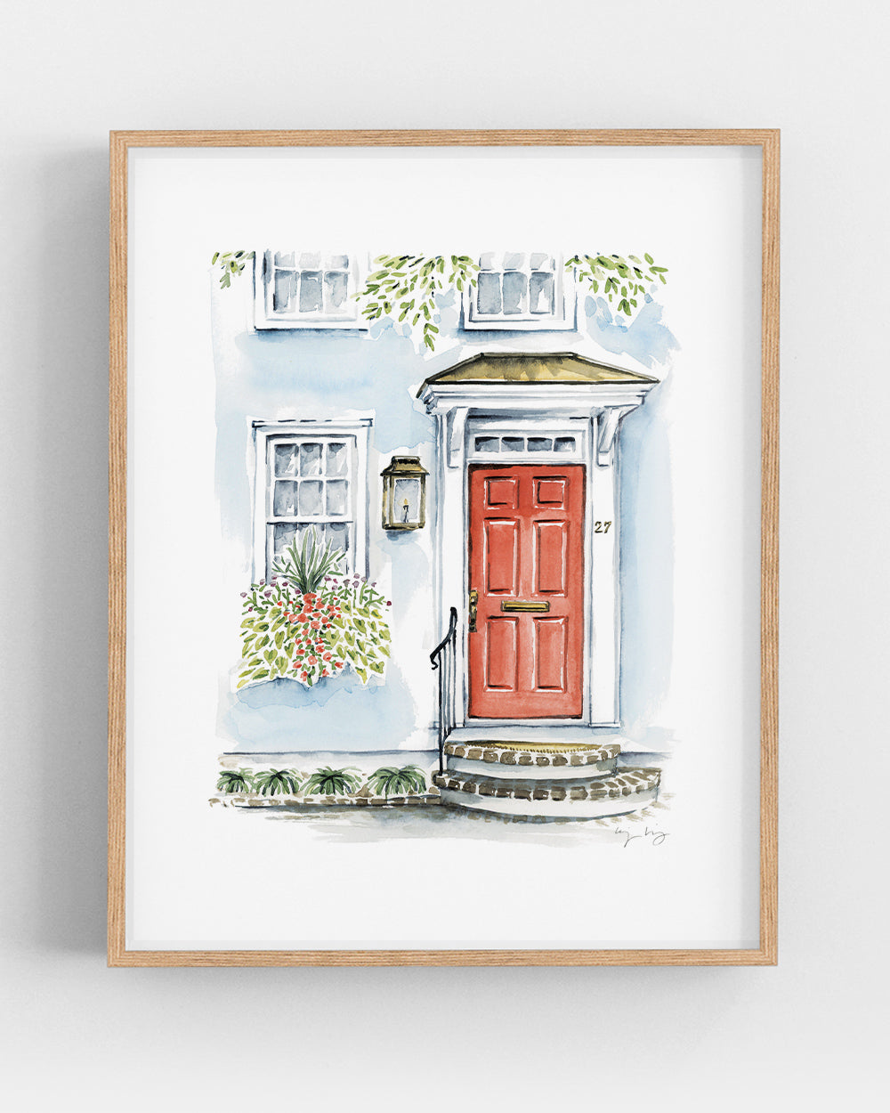 Art print features a watercolor painting of a Charleston, SC flower box.