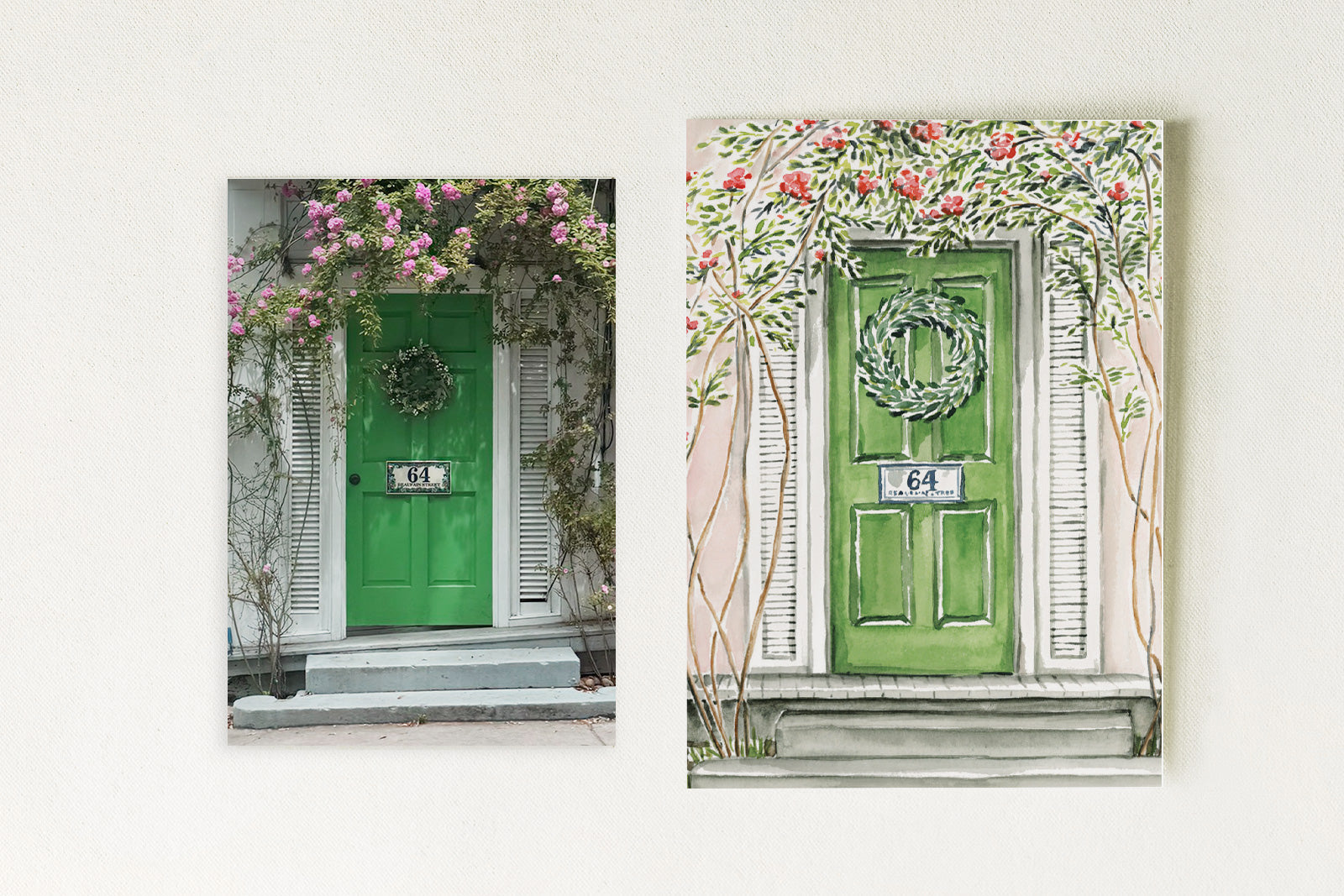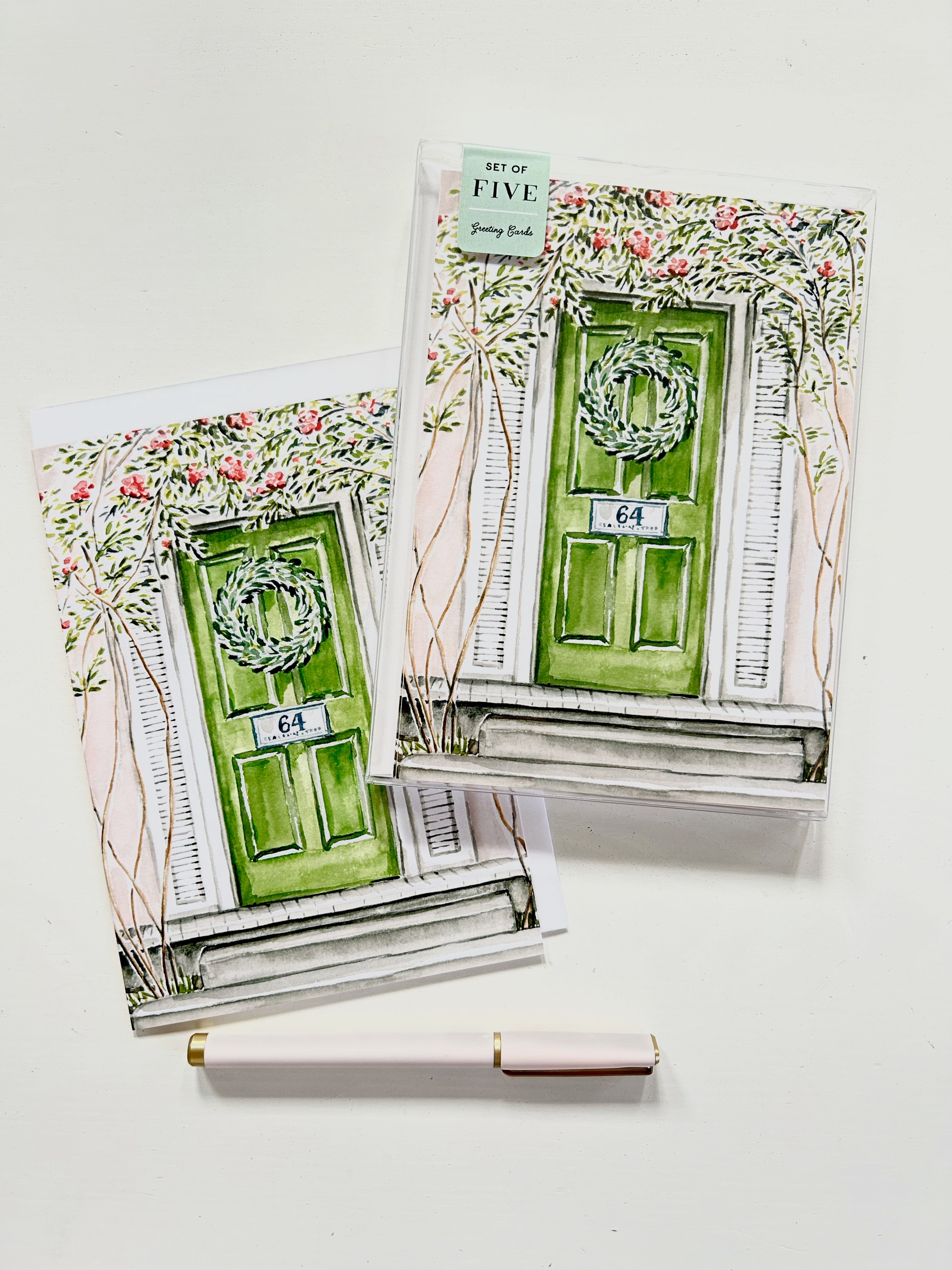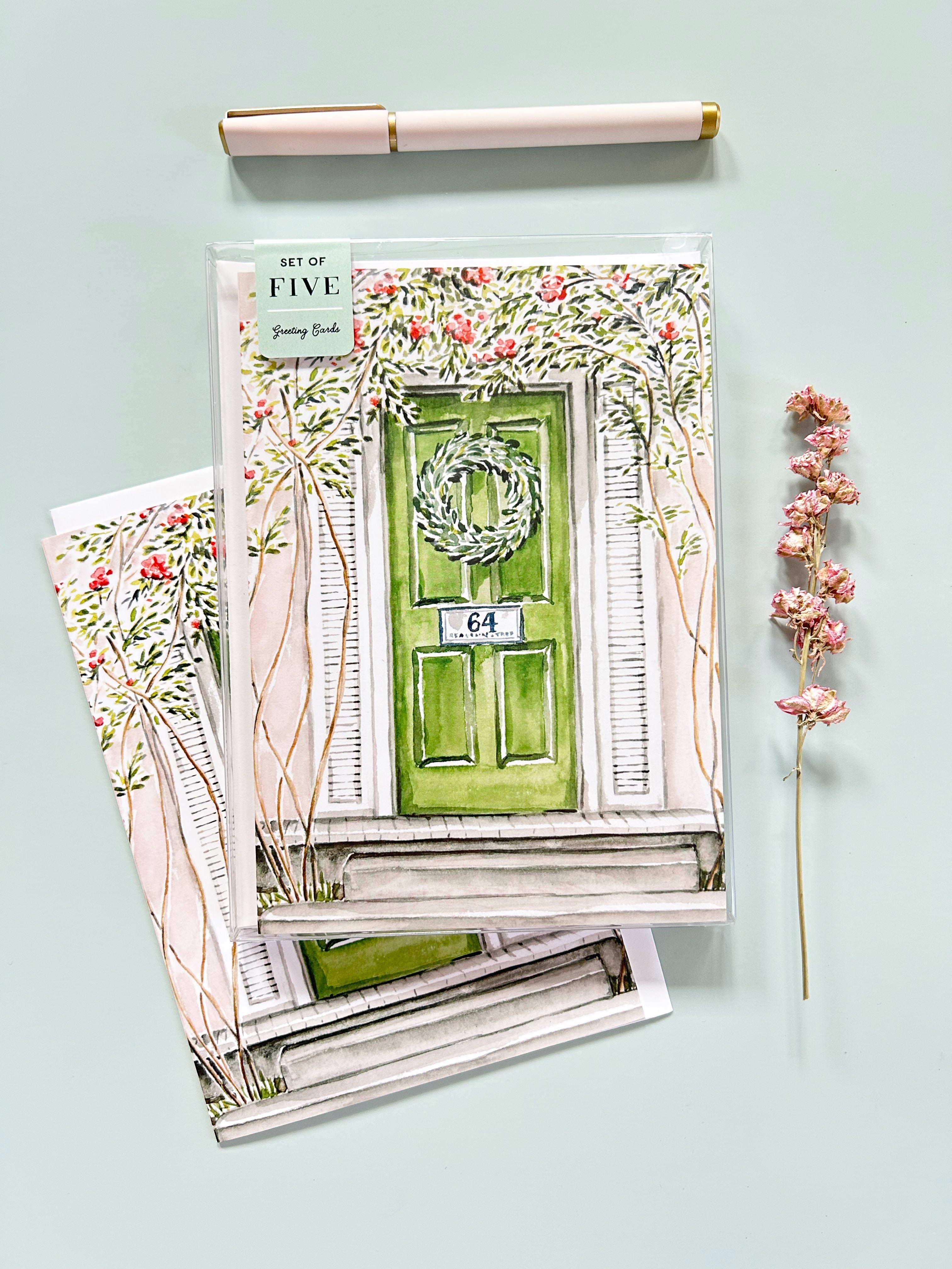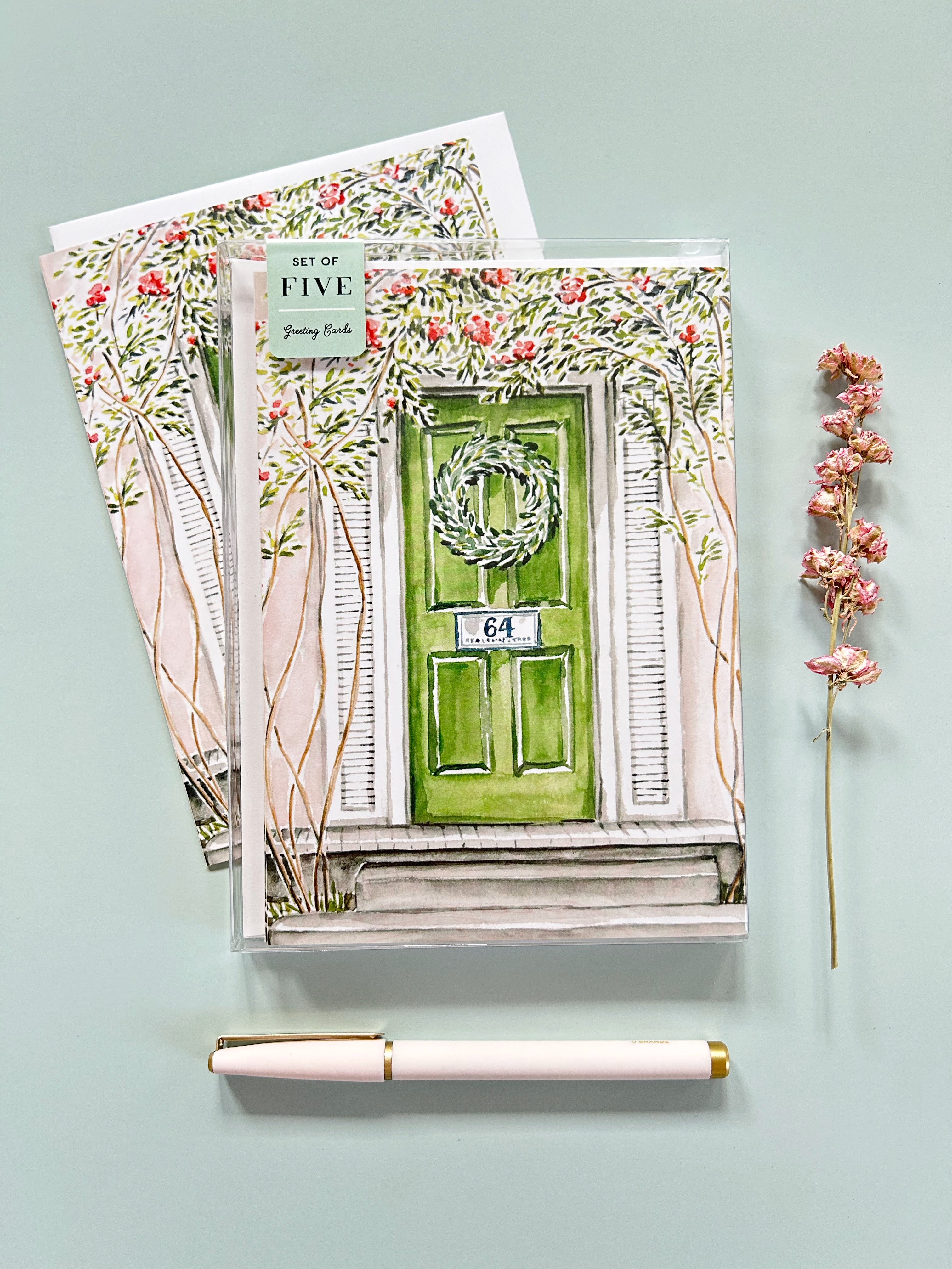 Single card featuring a pink house with green door. (Also available as an 11x14 art print.)