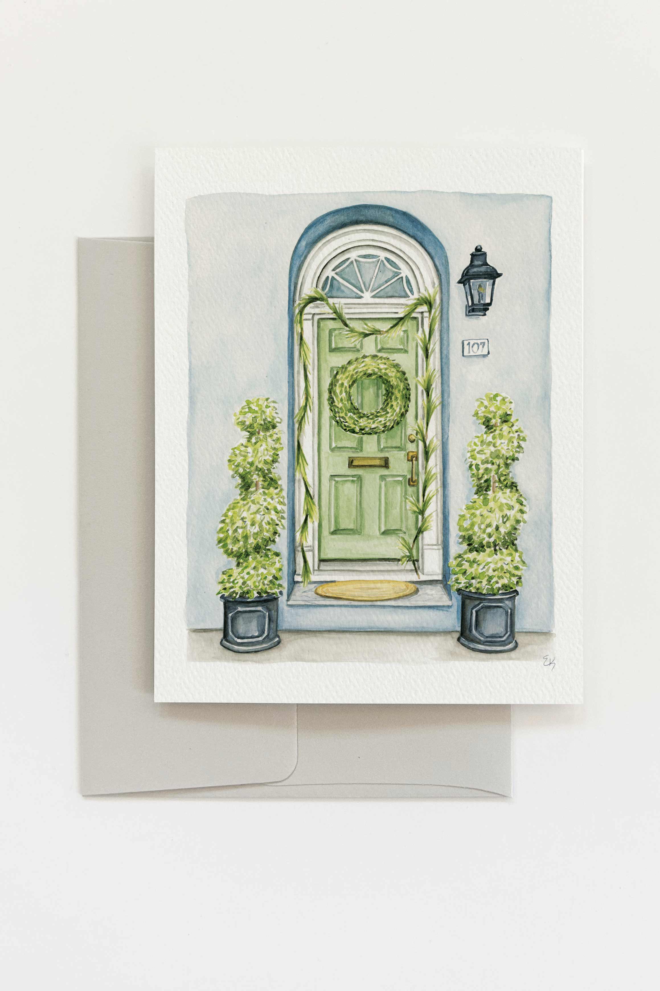 Inspired by the architectural design of the Lowcountry, the artwork showcases an intricately detailed timeless front door from Charleston, SC. A festive wreath and garland adorn the green door with holiday cheer.