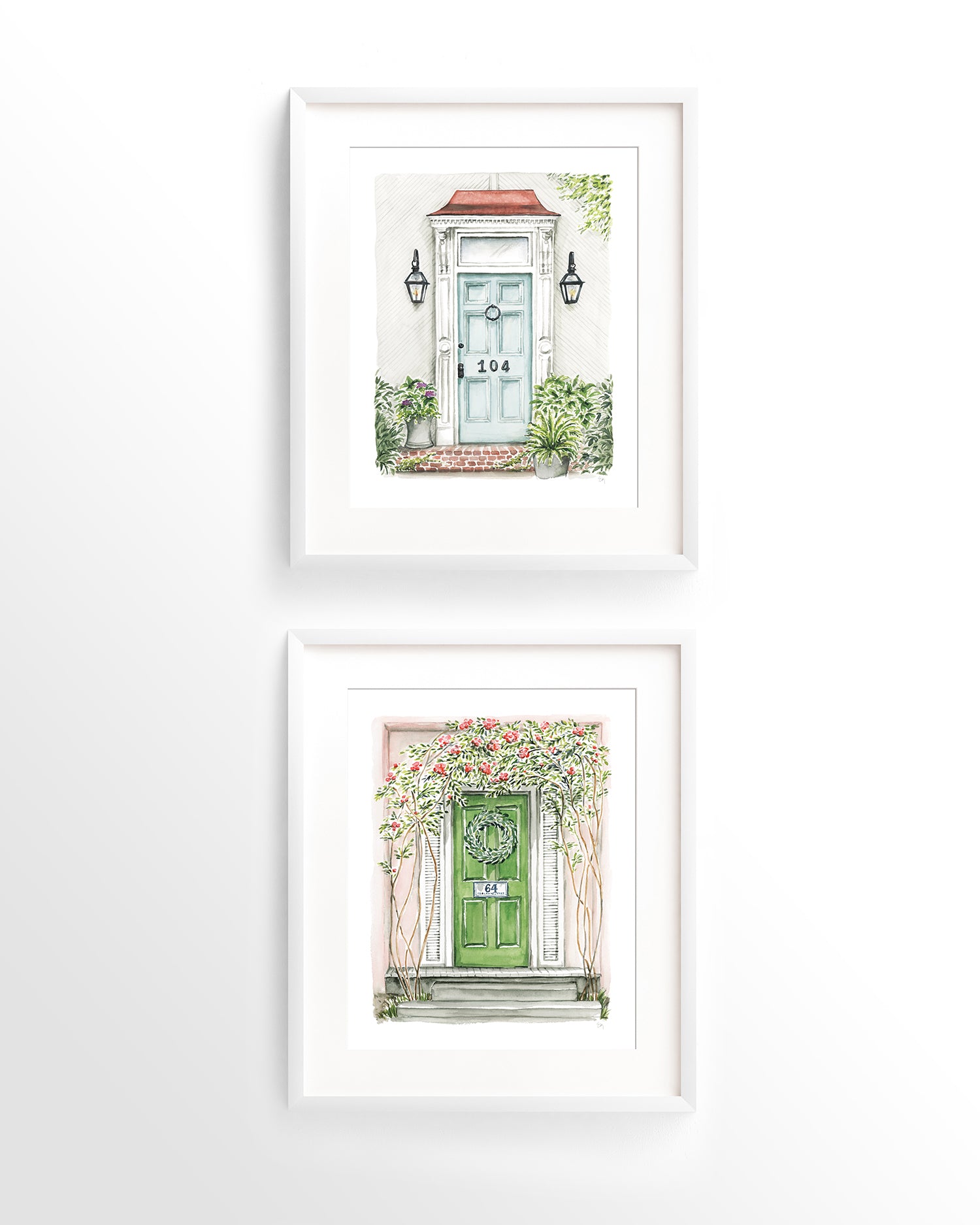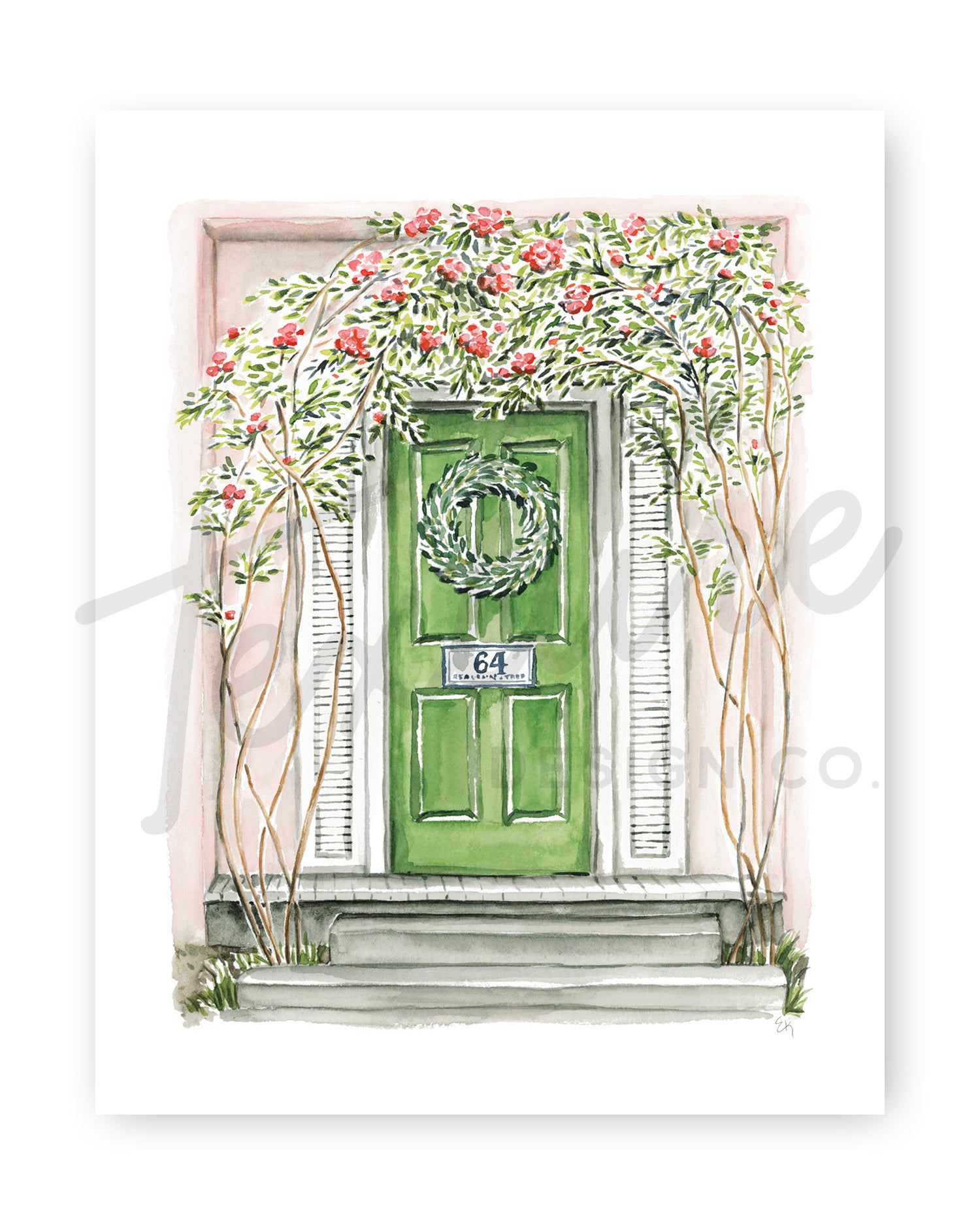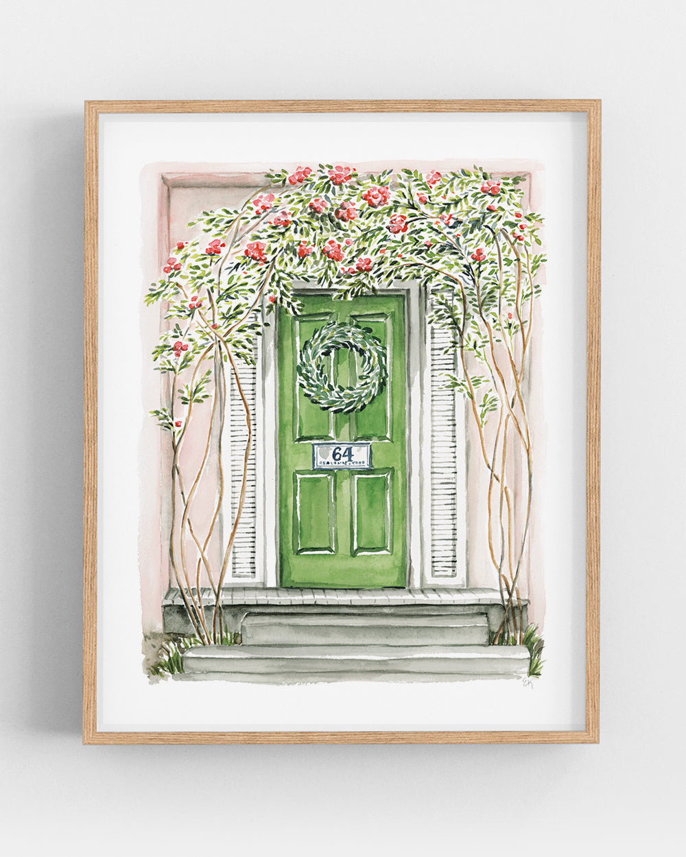 Inspired by the east coast, the watercolor print showcases an intricately painted timeless front door.