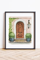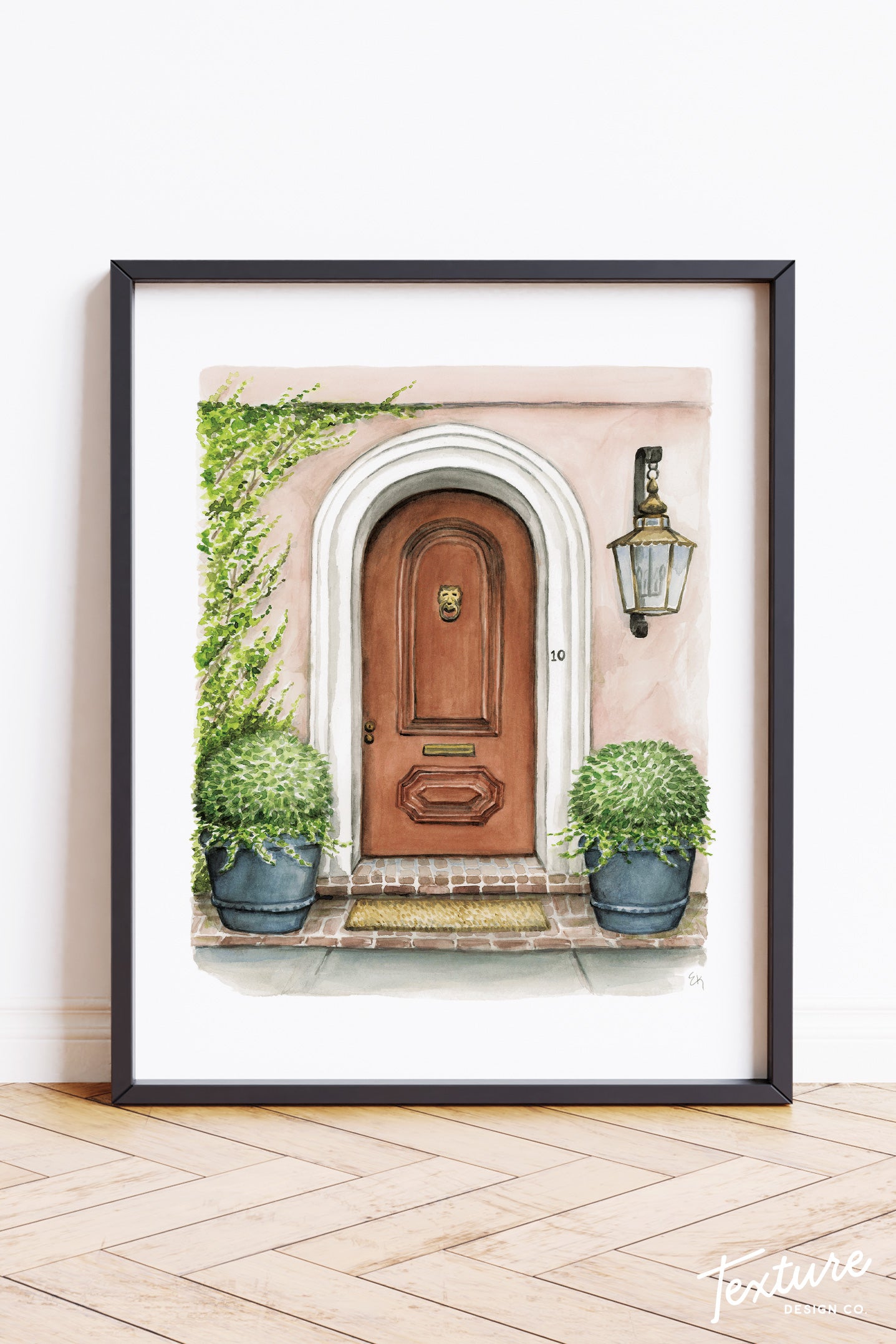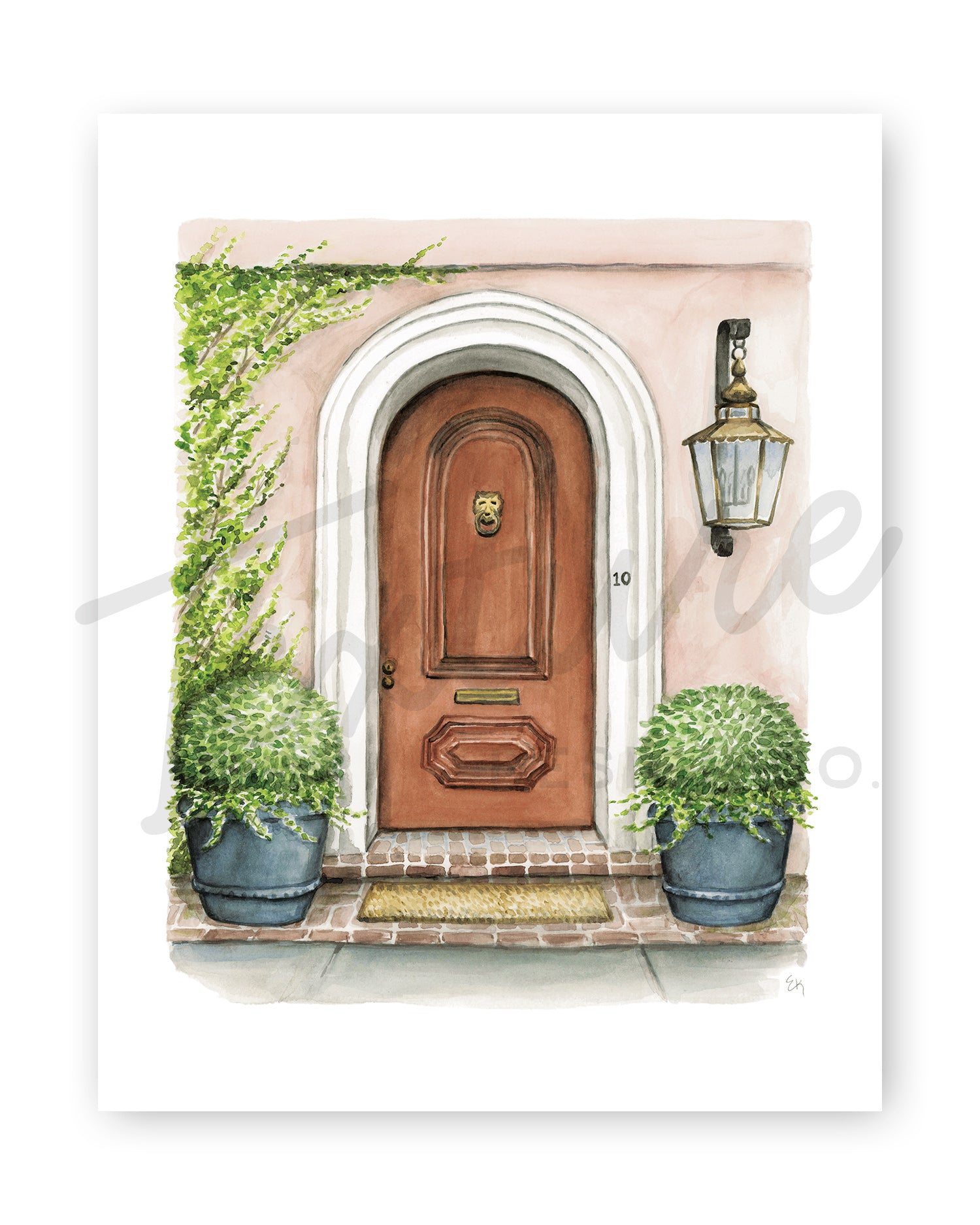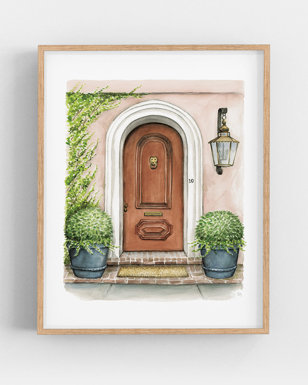 Inspired by the architectural design of the Lowcountry, the art print showcases an intricately detailed timeless front door from Charleston, SC. The large mahogany door sits in a whimsical atmosphere of greenery and old world charm.