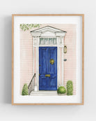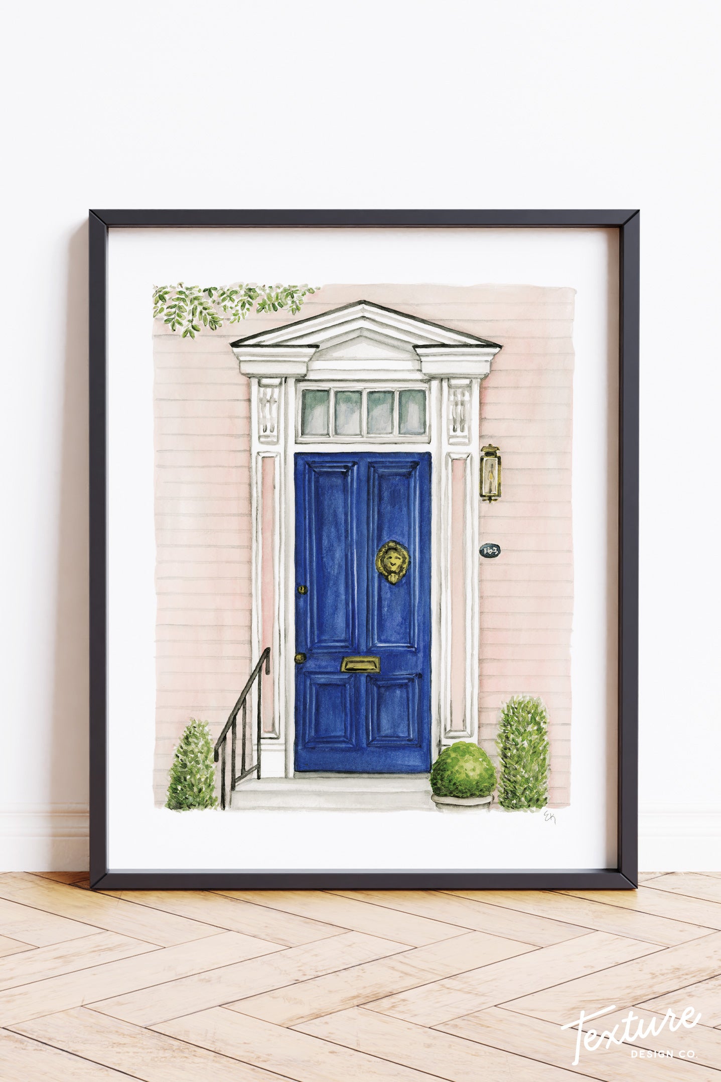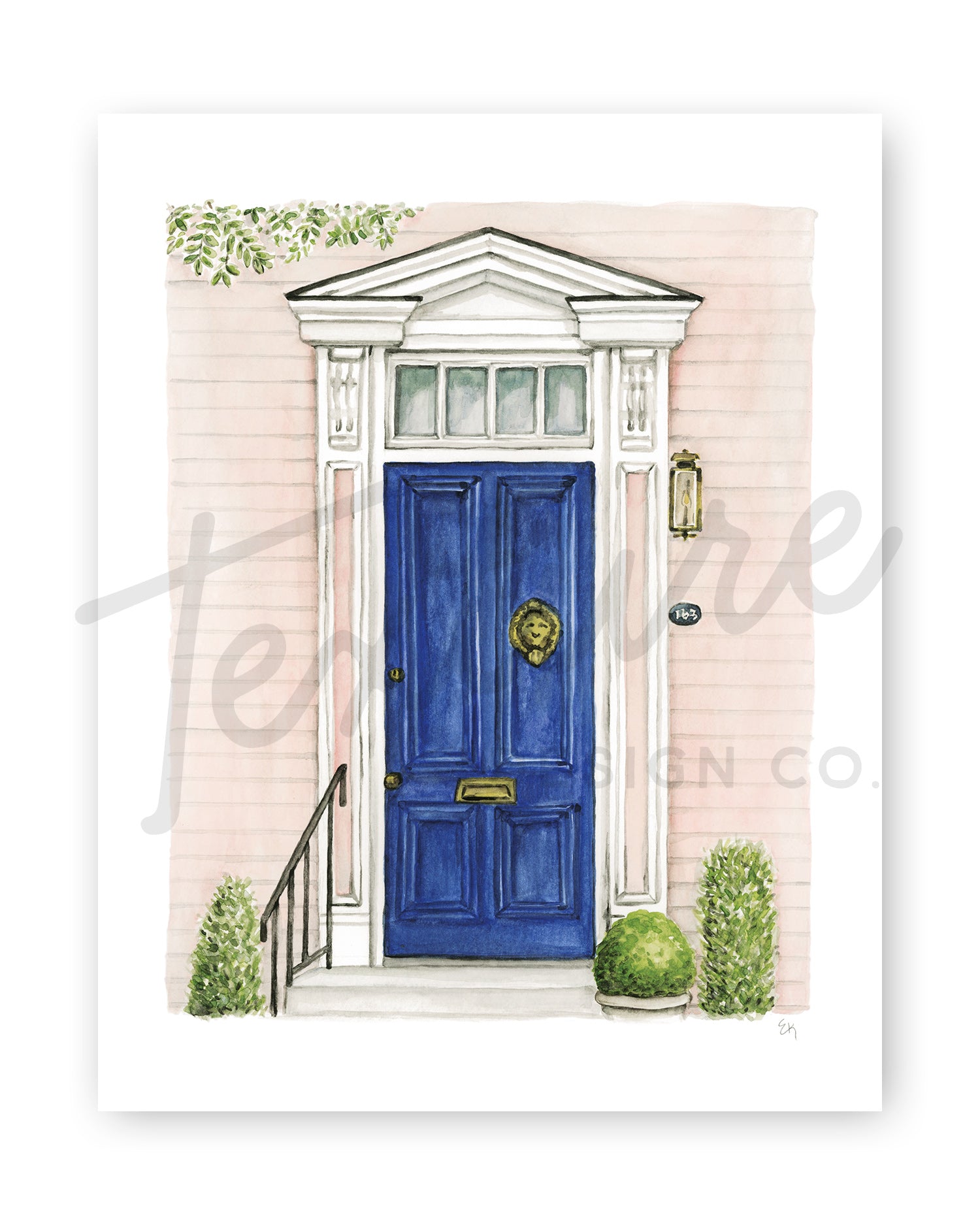 Inspired by the architectural design of the Lowcountry, the art print showcases an intricately detailed timeless front door from Charleston, SC. The deep blue of the door stands out against the soft pink of the house. A bold brass lion knocker and classic brass mail slot draw the eye, giving a sense of history to the home.