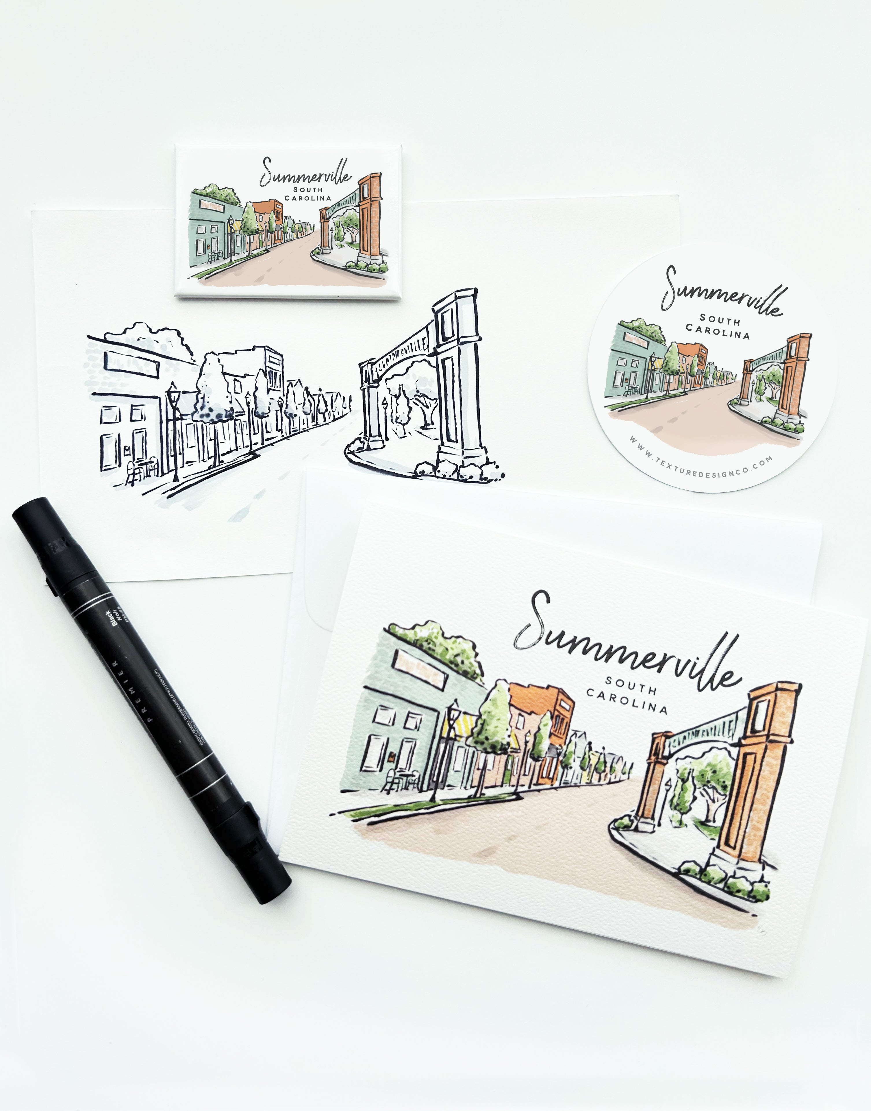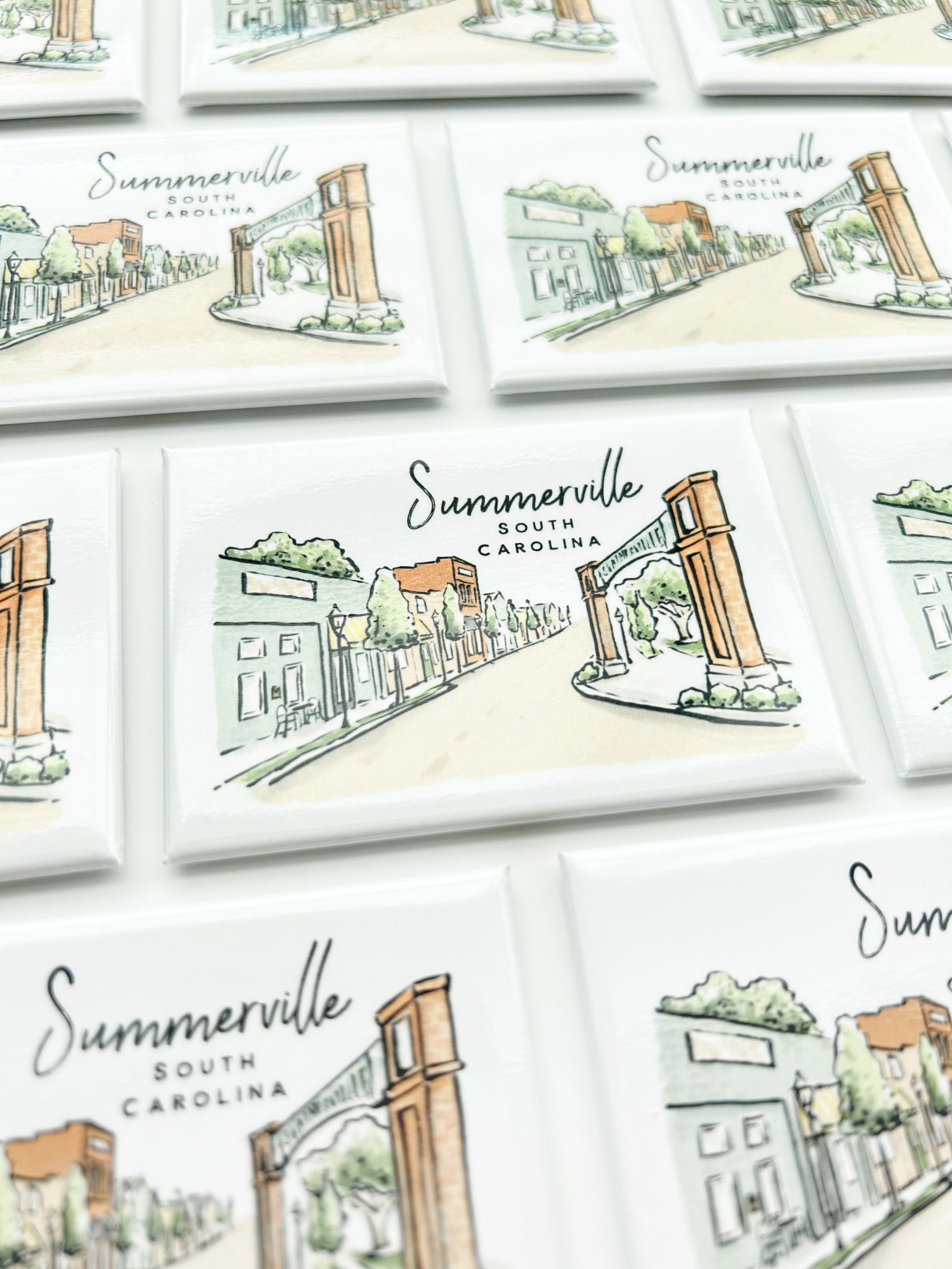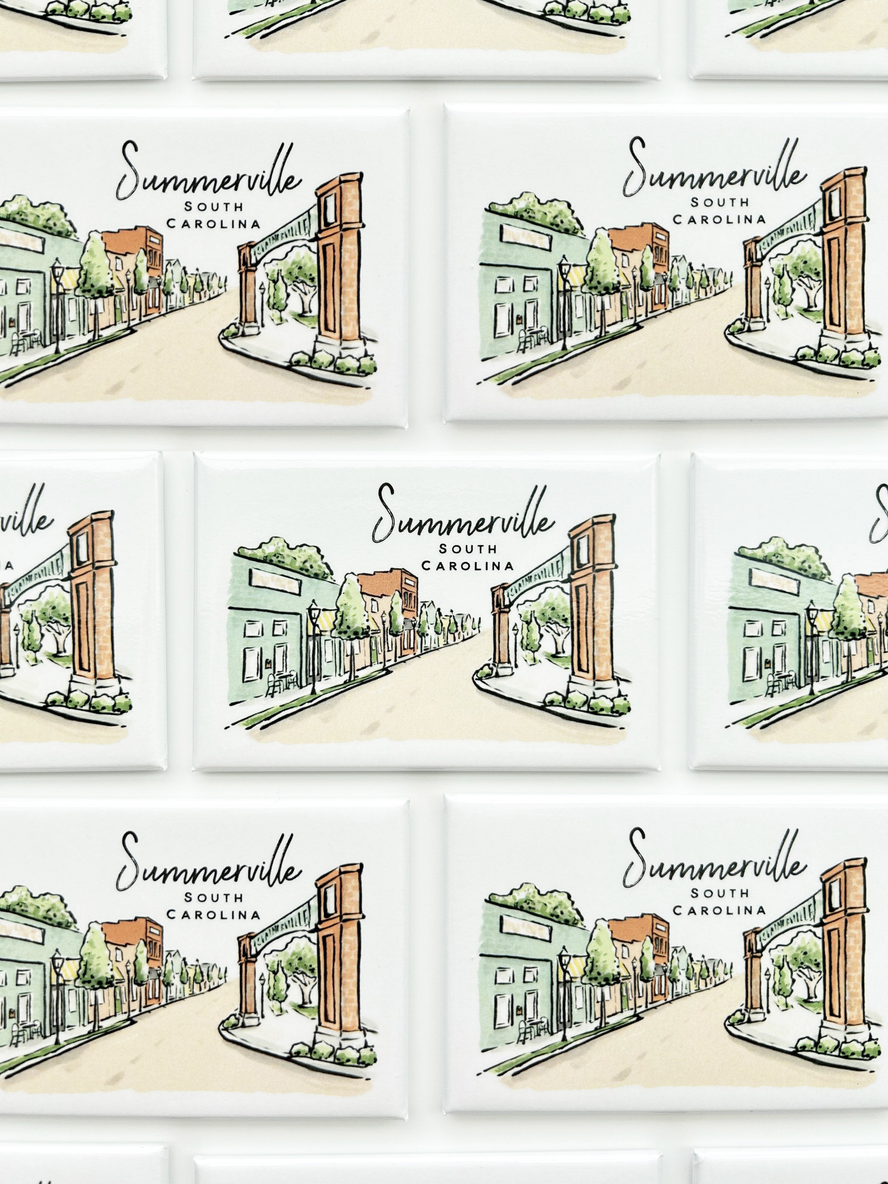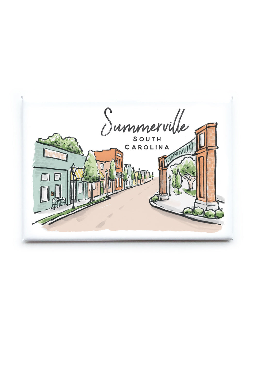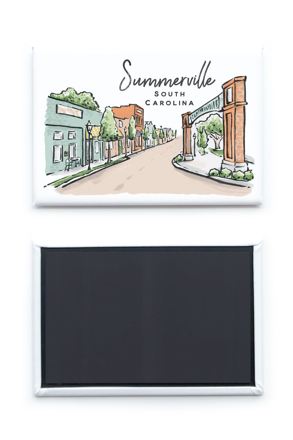 The Summerville magnet includes a colorful scene of South Main Street. Cheerful and charming, use this magnet to commemorate a Summerville trip or gift to a Flowertown local.