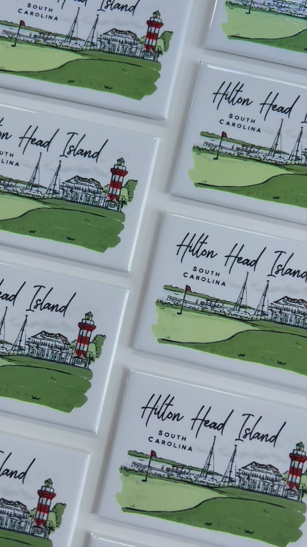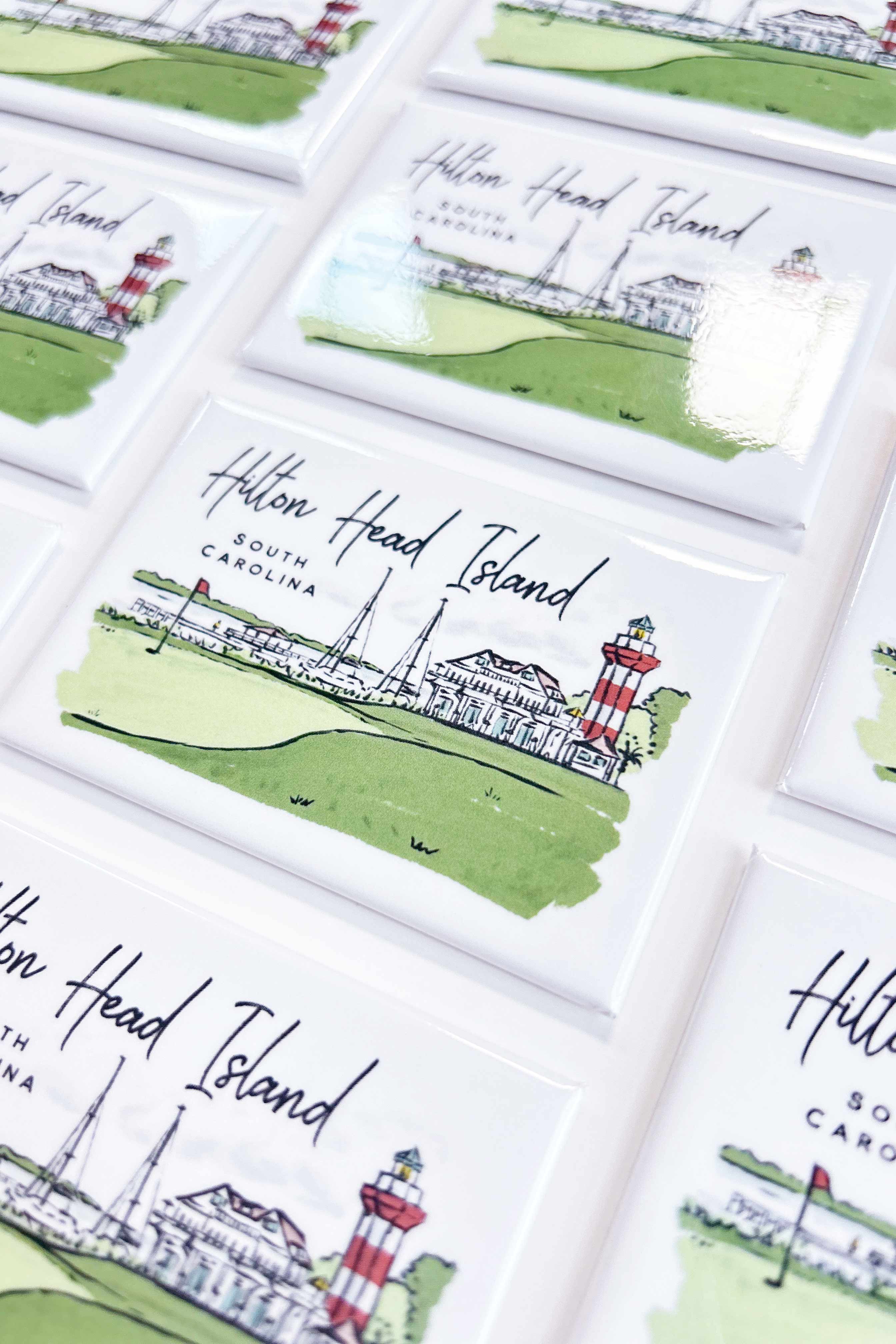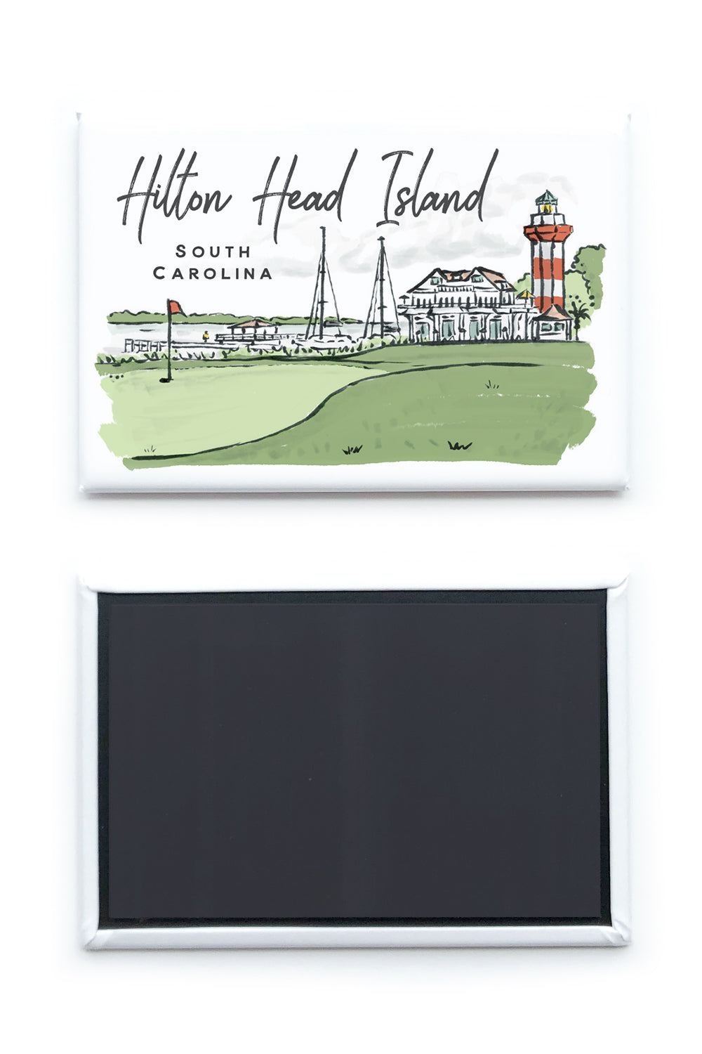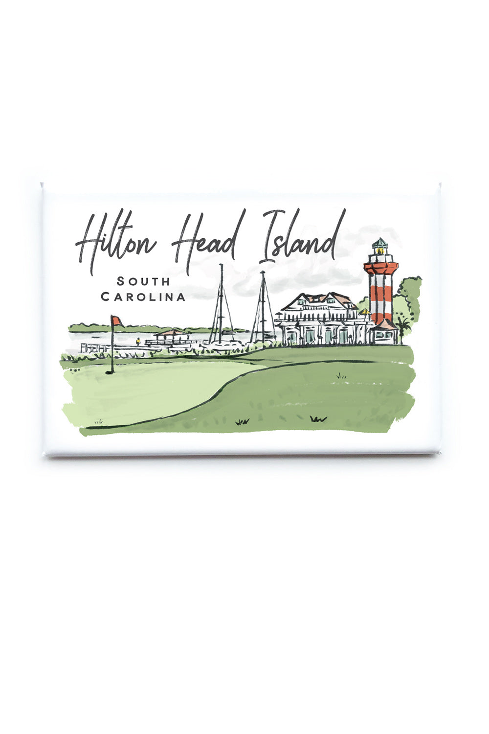 The Hilton Head magnet includes a colorful scene of the 18th hole and the lighthouse at Harbour Town. Cheerful and charming, use this magnet to commemorate a Hilton Head Island trip or gift to a HHI local.