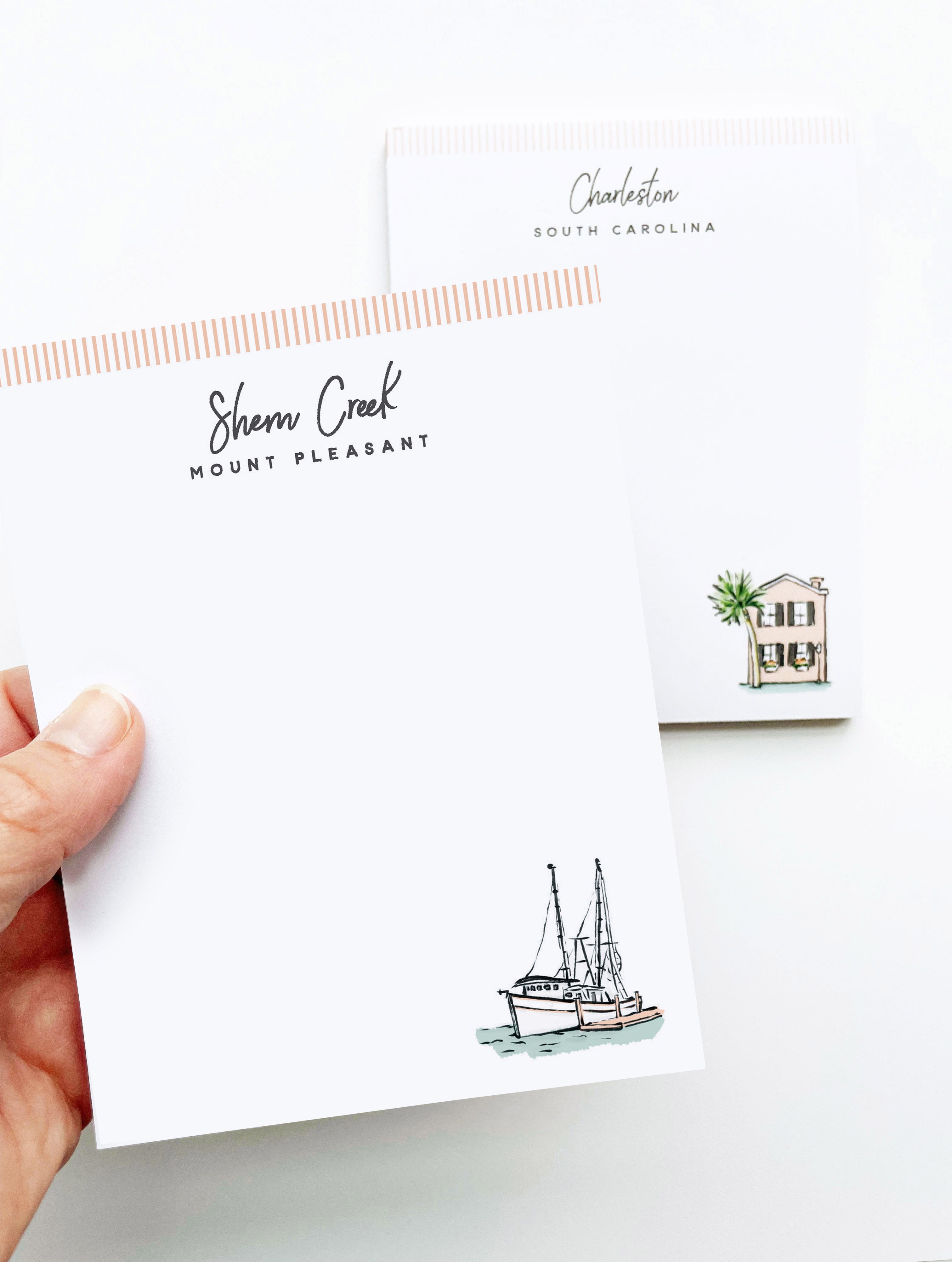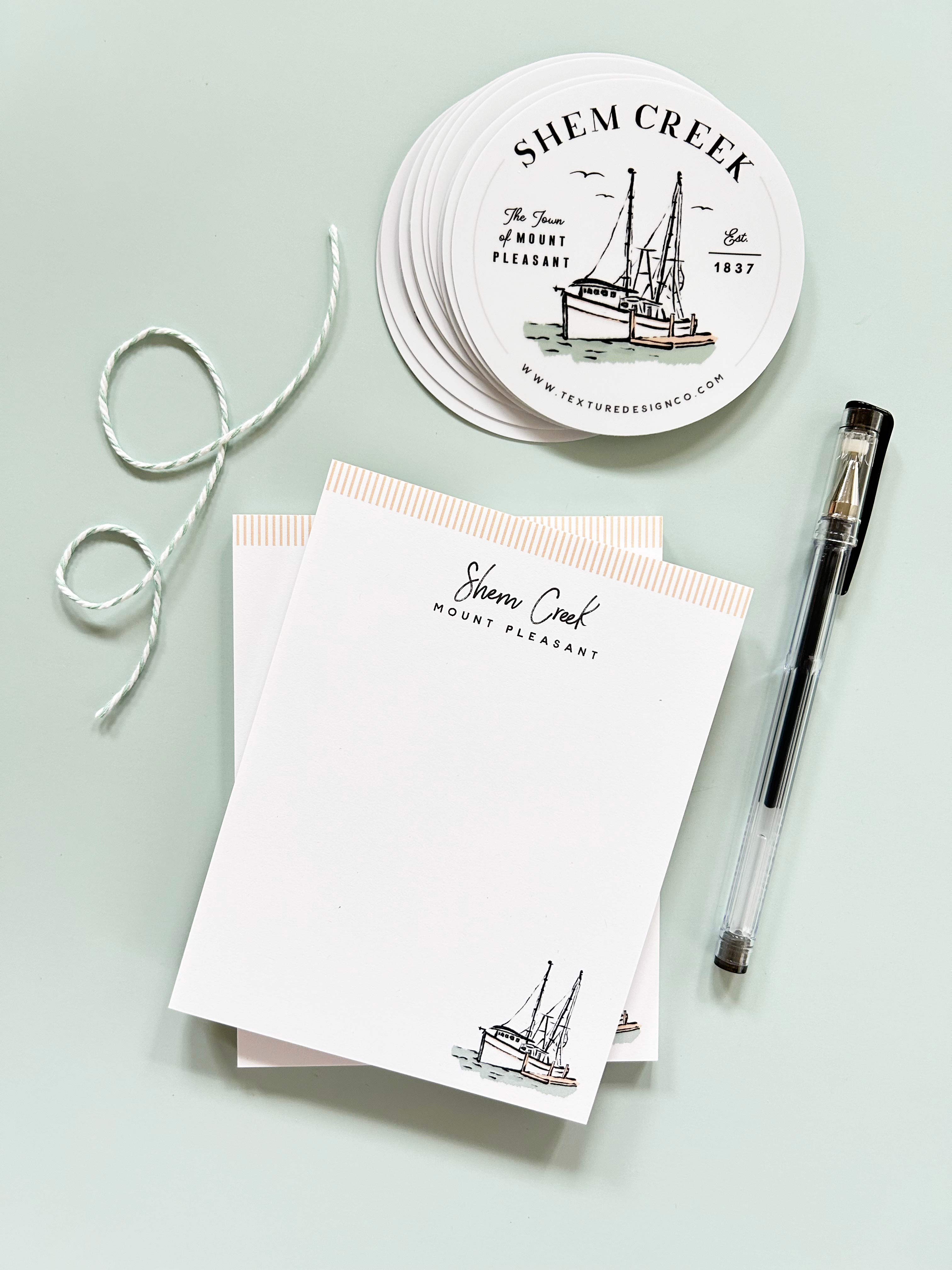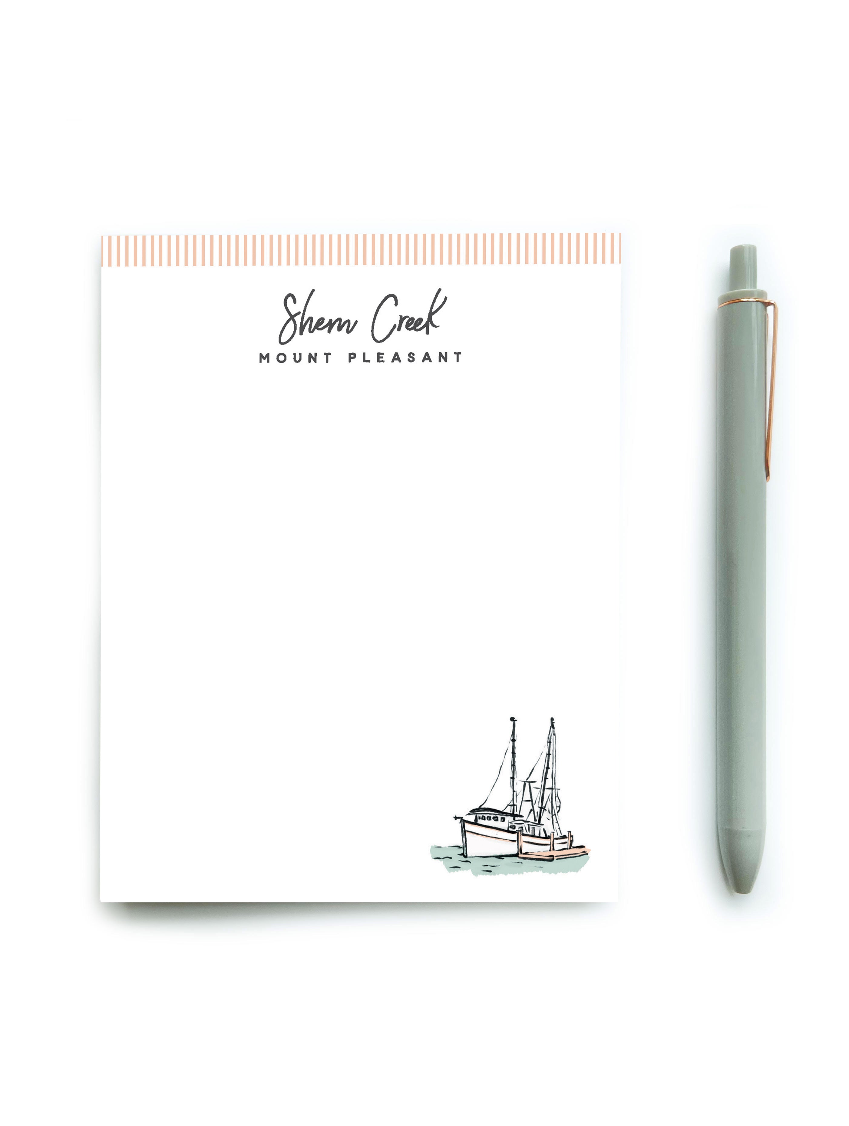 The Shem Creek notepad includes a shrimp boat illustration. Pretty and practical, use this notepad to make to-do lists more fun, commemorate a trip, or gift to a friend.