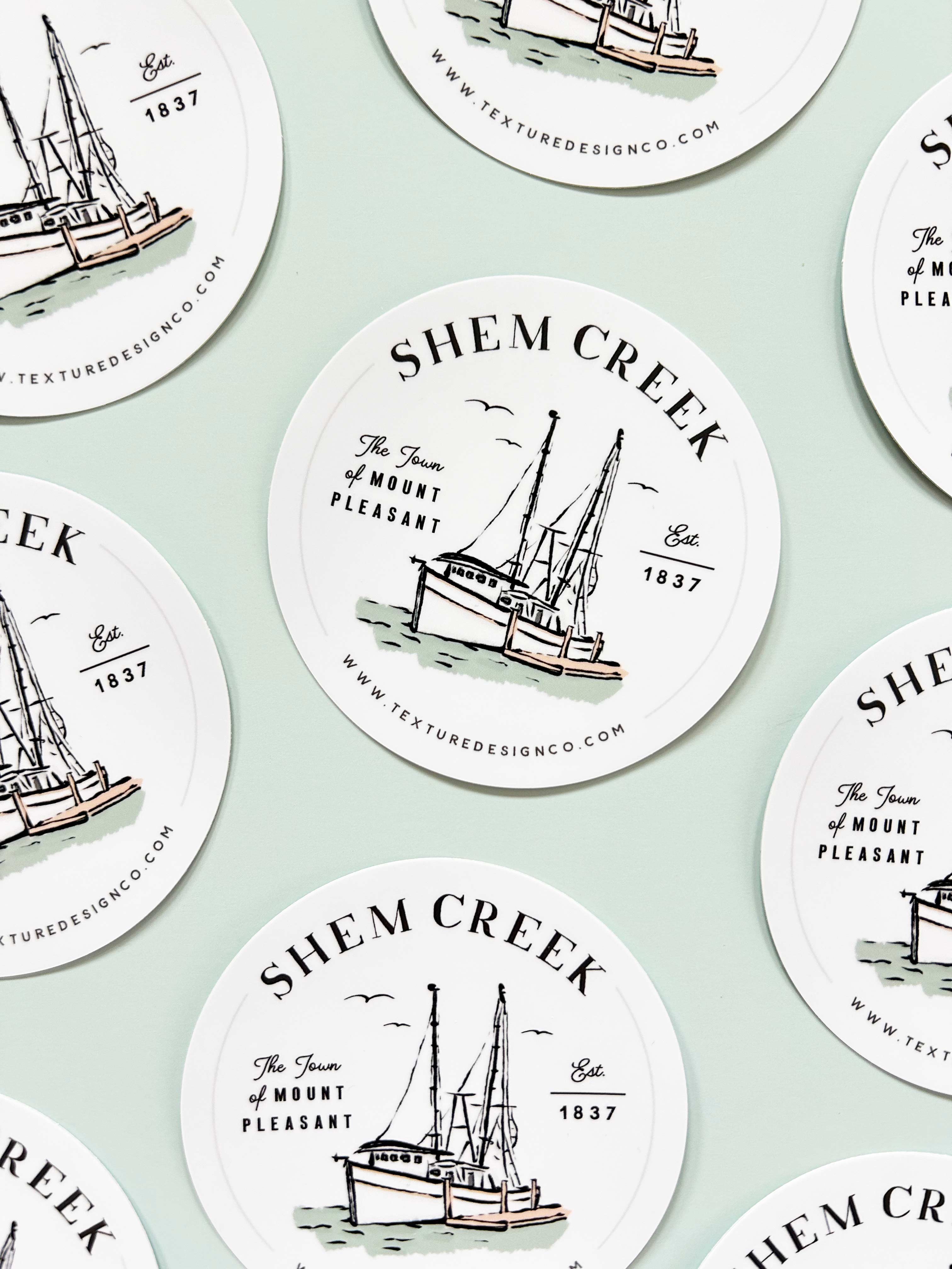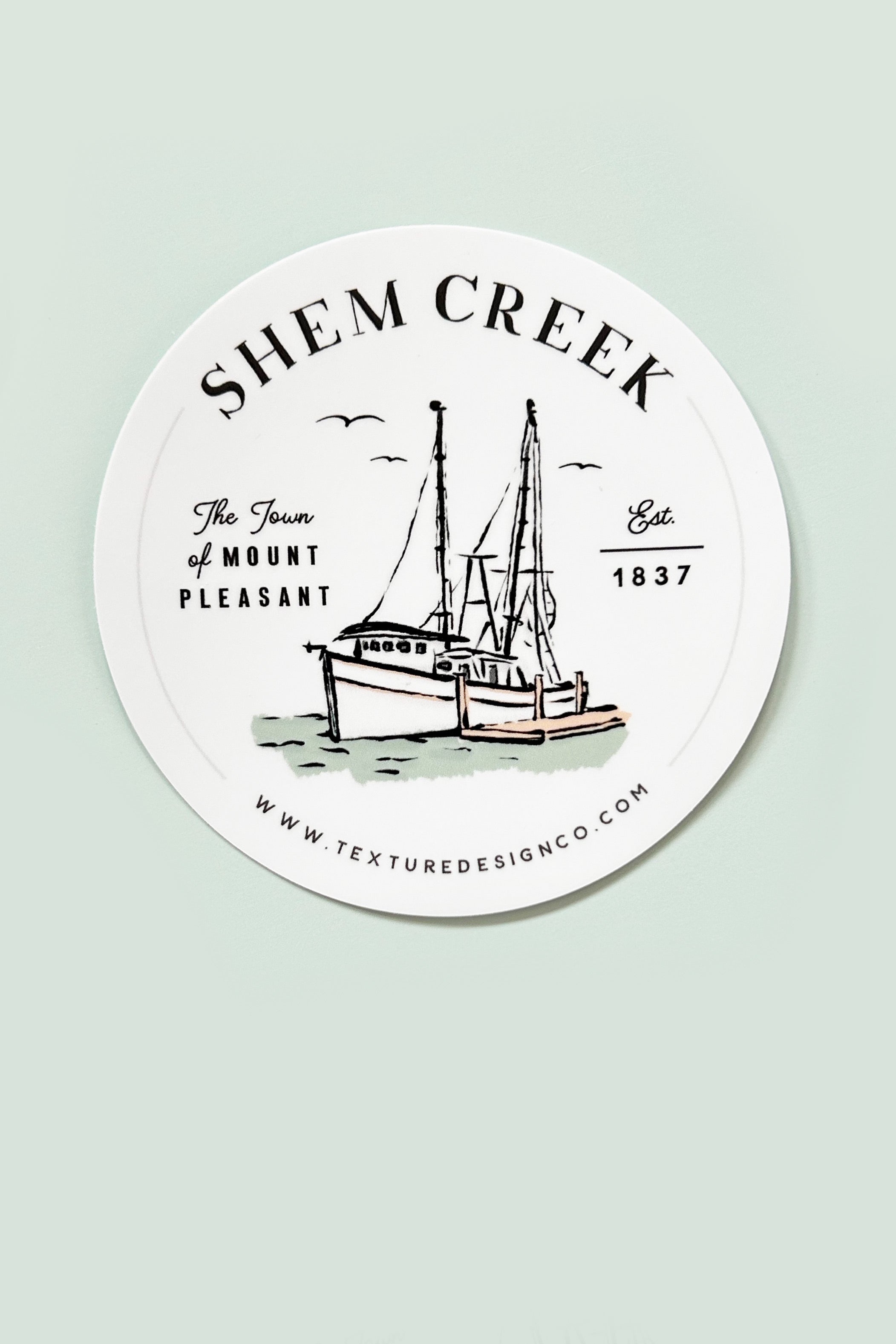 The circular Shem Creek sticker is heavy duty and looks great on a water bottle, notebook, laptop, or bumper! The illustration features a shrimp boat on historic Shem Creek.