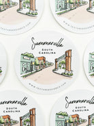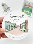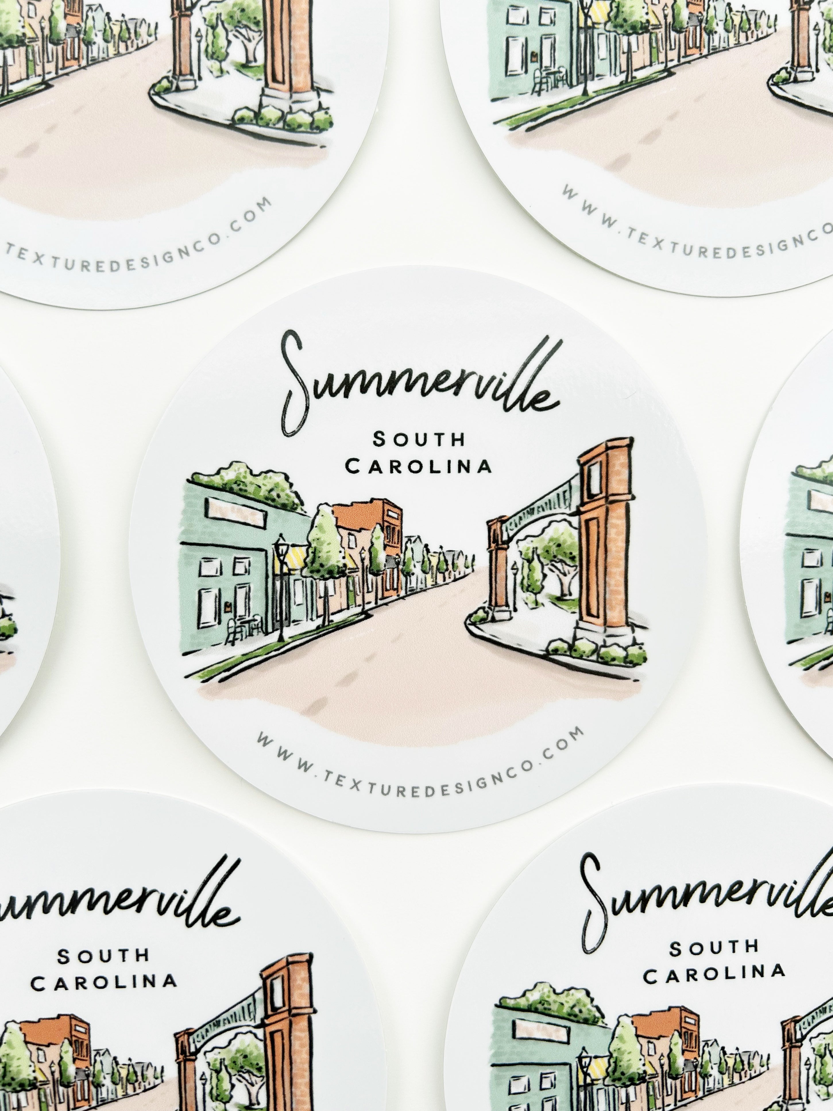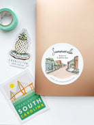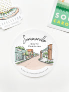 The circular downtown Summerville sticker is heavy duty and looks great on a water bottle, notebook, laptop, or bumper!