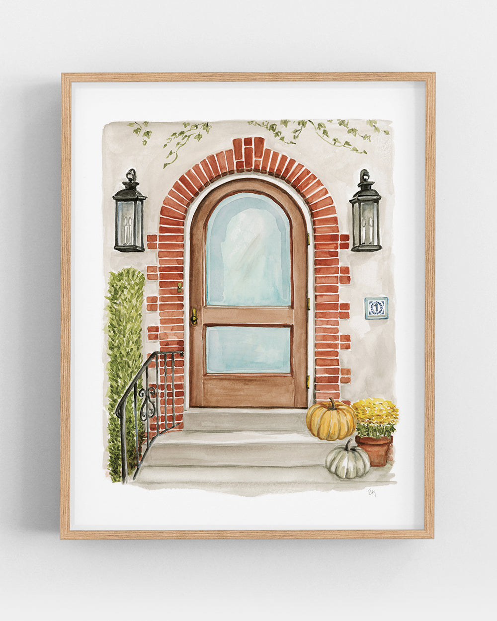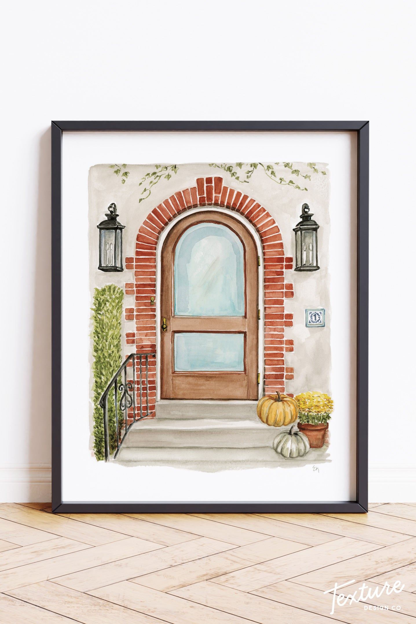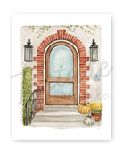 Inspired by the architectural design of the Lowcountry, the art print showcases an intricately detailed timeless front door from Charleston, SC. The perfectly placed pumpkins and chrysanthemums hint at the autumn theme.