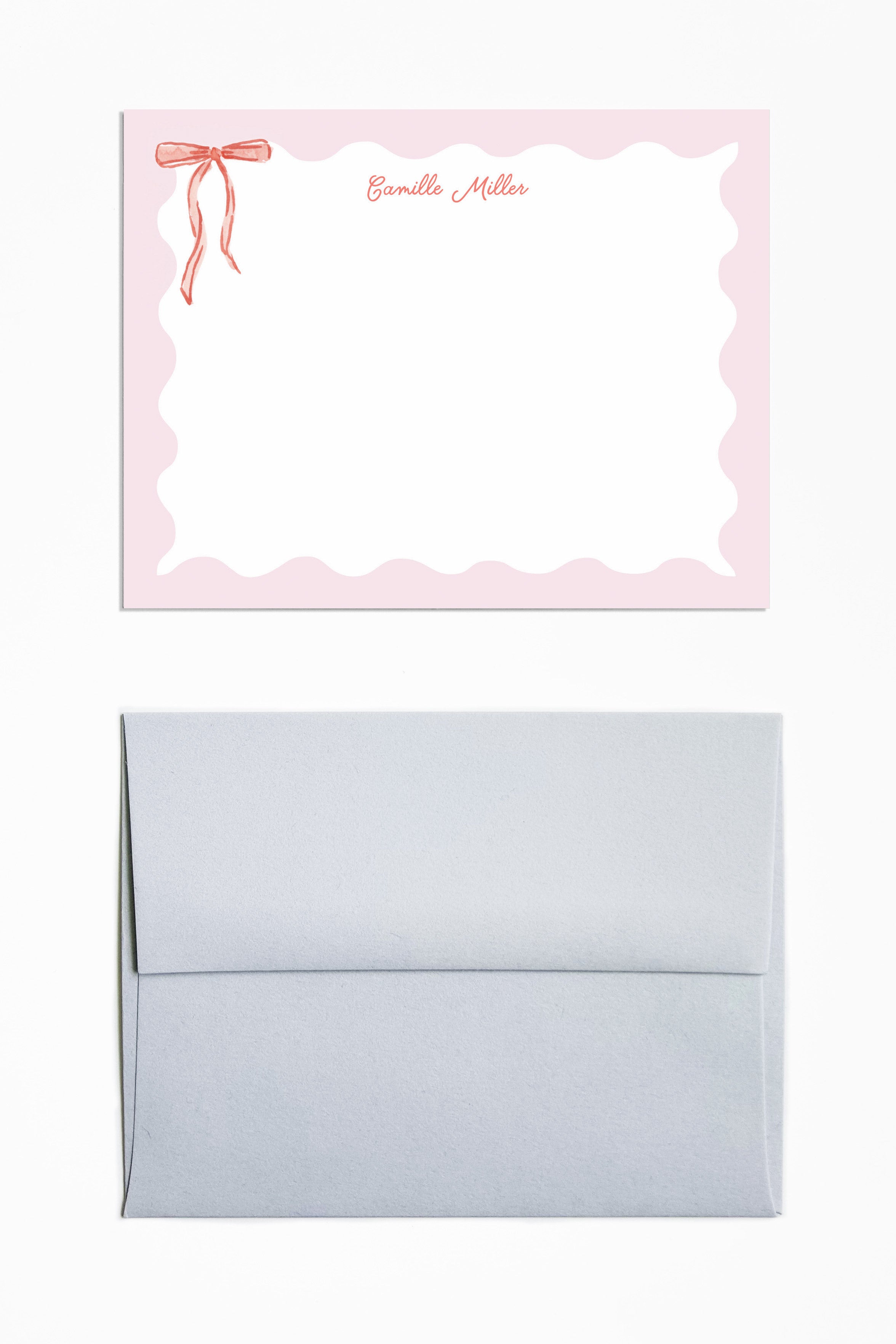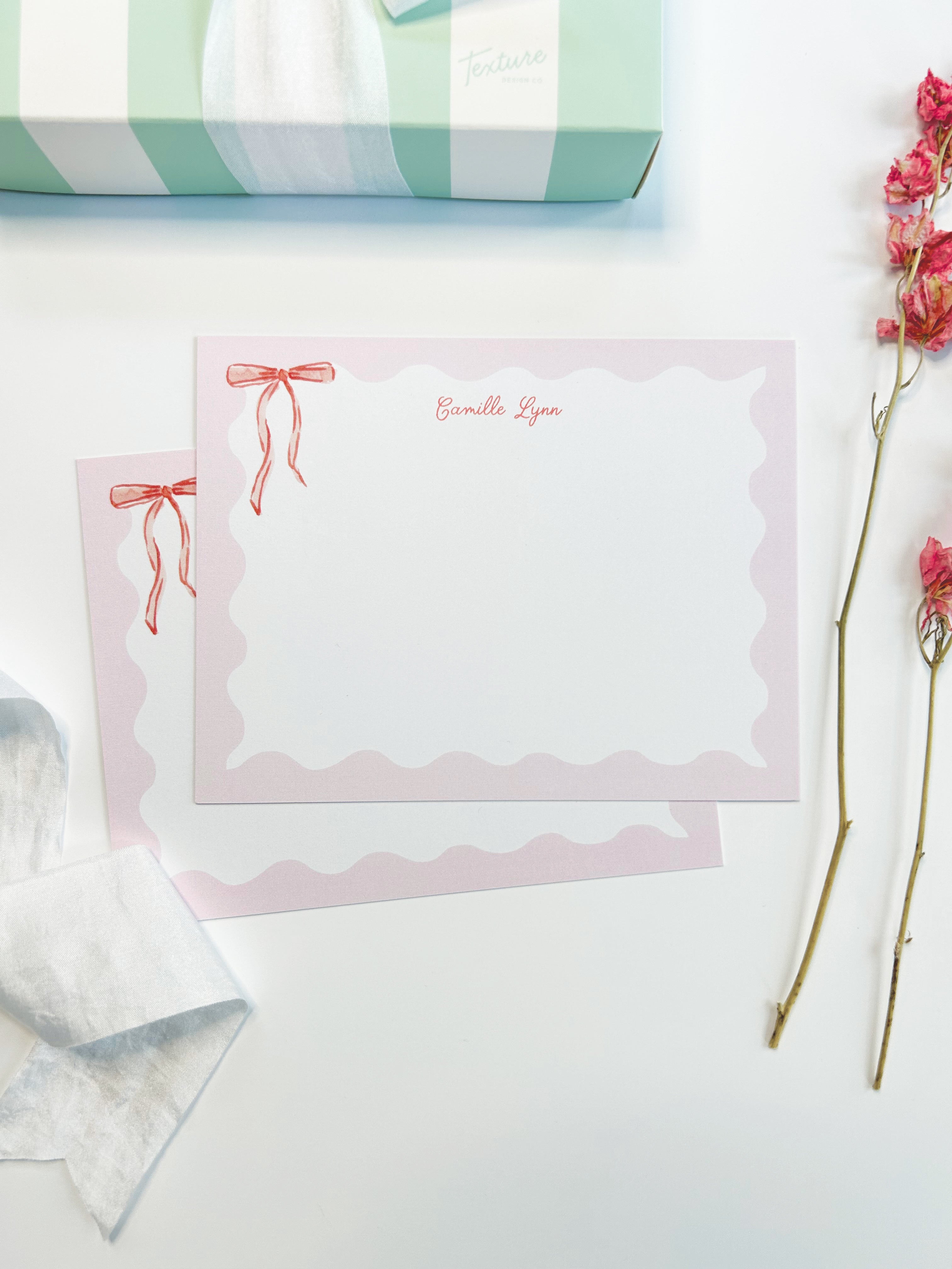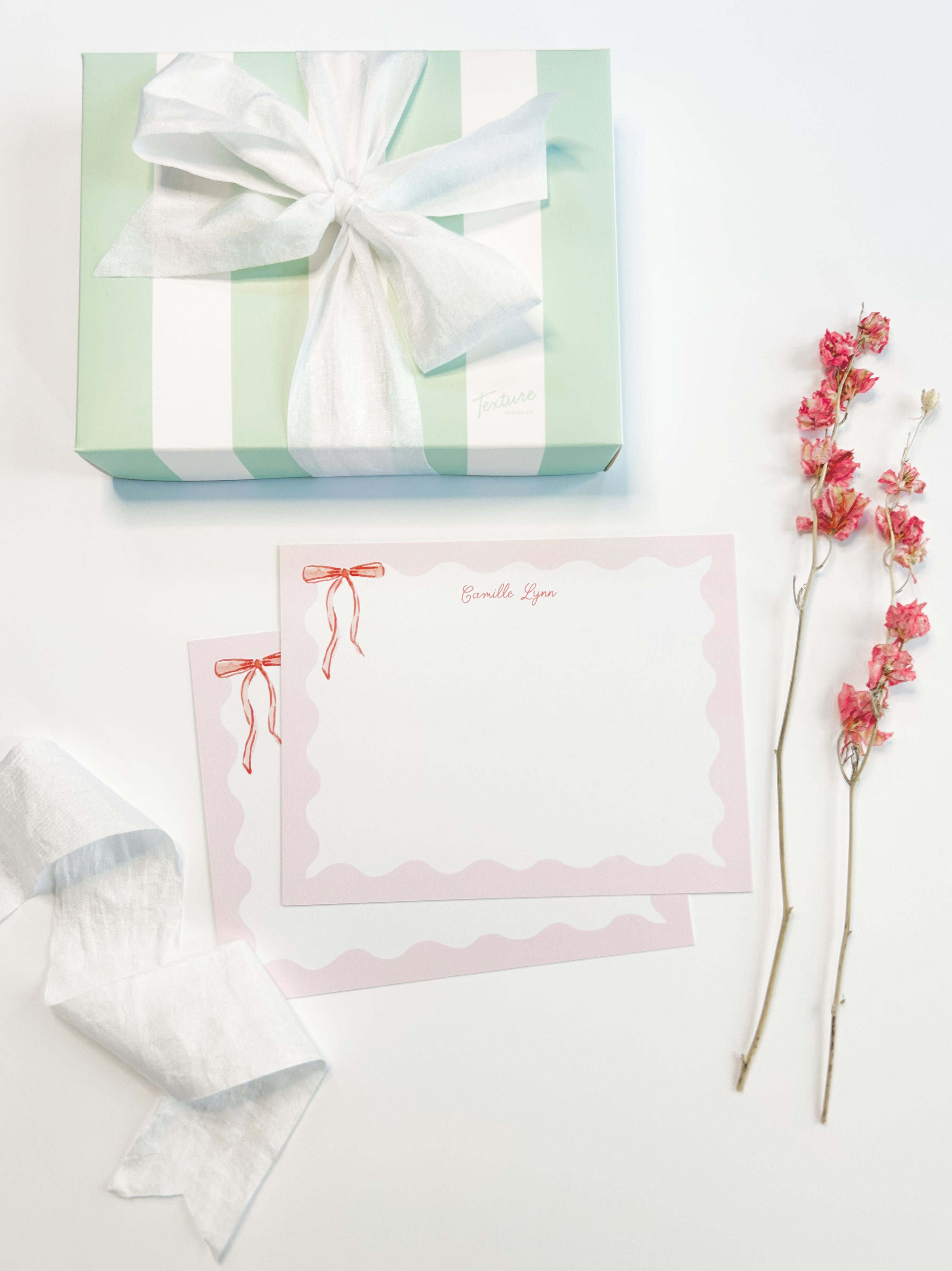 The Camille is a sweet and delicate stationery set, featuring soft pink and red hues with a watercolor satin ribbon detail. Use this stationery set to add a touch of sweetness to notes and thank you's.