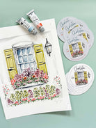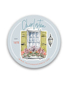 The circular Charleston Flower Box sticker in Blue showcases a classic Charleston flower box, bursting with colorful blooms overlayed on a blue-gray background. The heavy duty sticker is perfect for decorating laptops, water bottles, or notebooks with a touch of Lowcountry elegance.