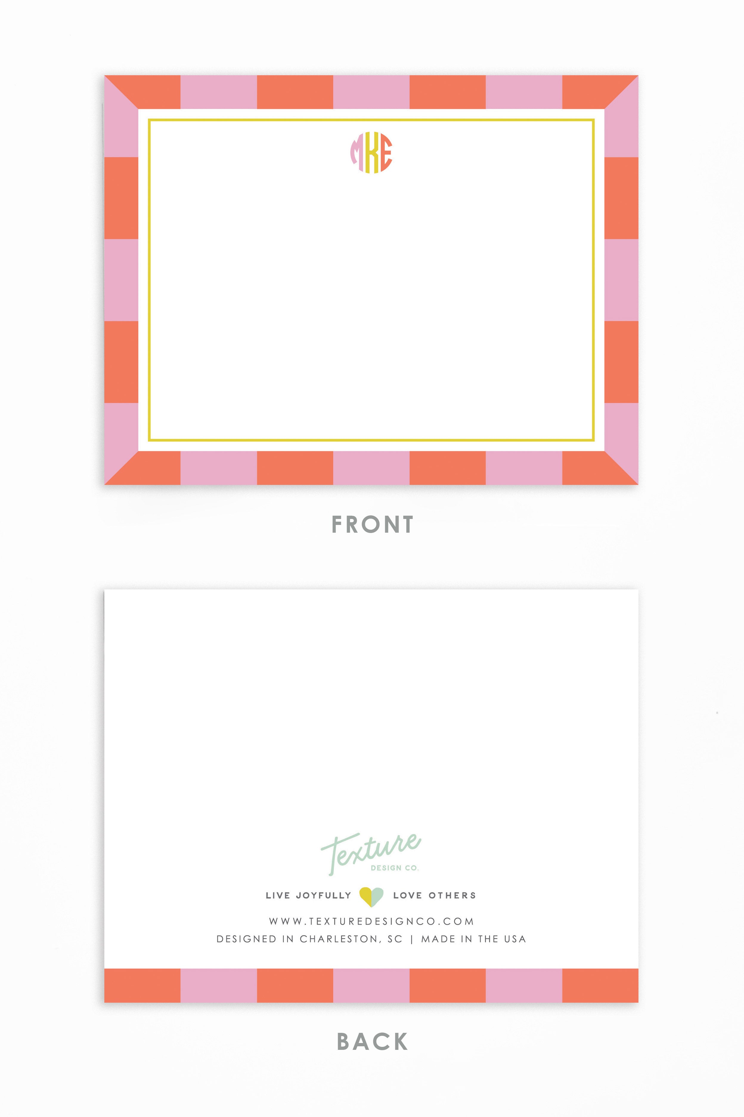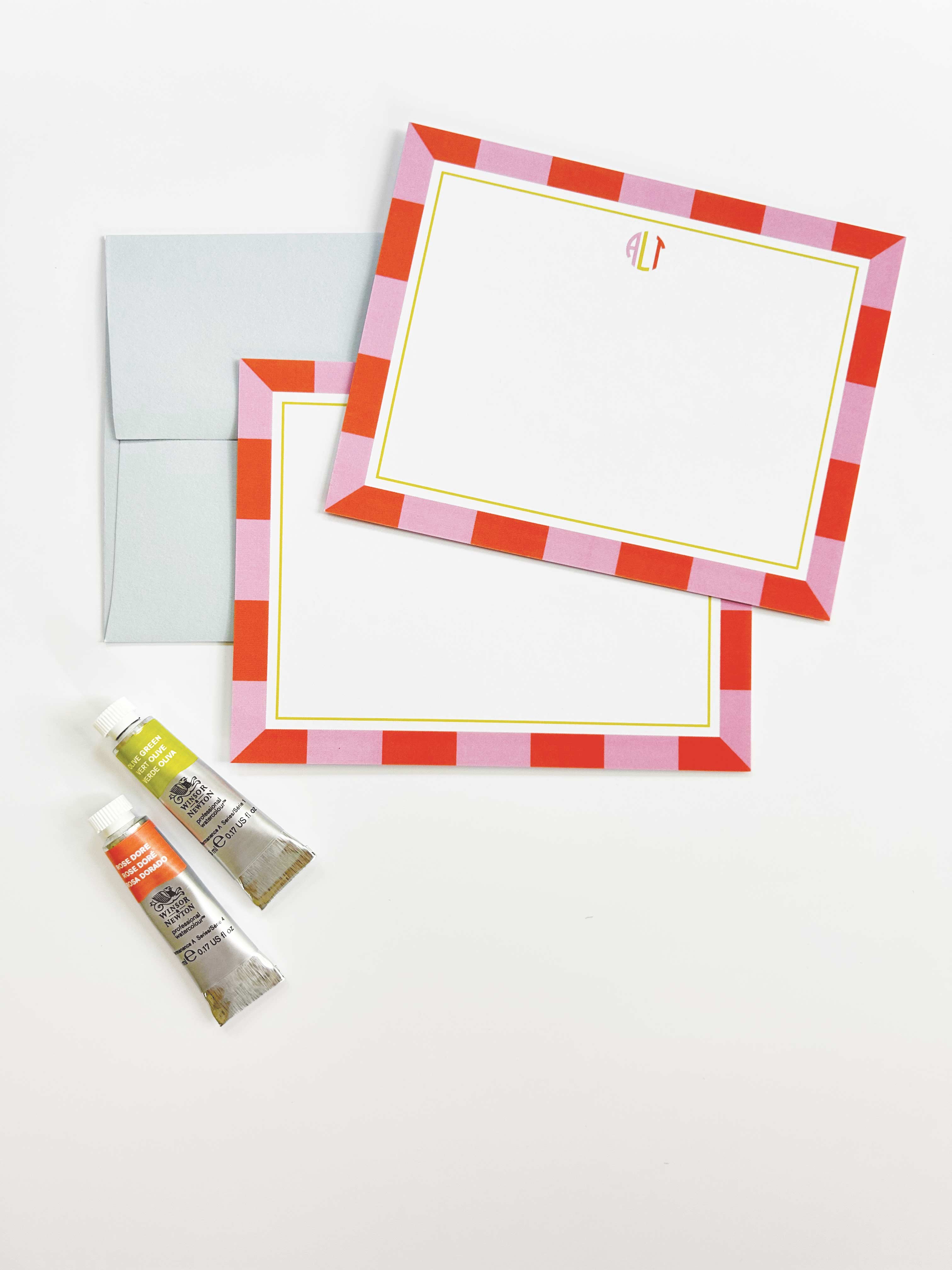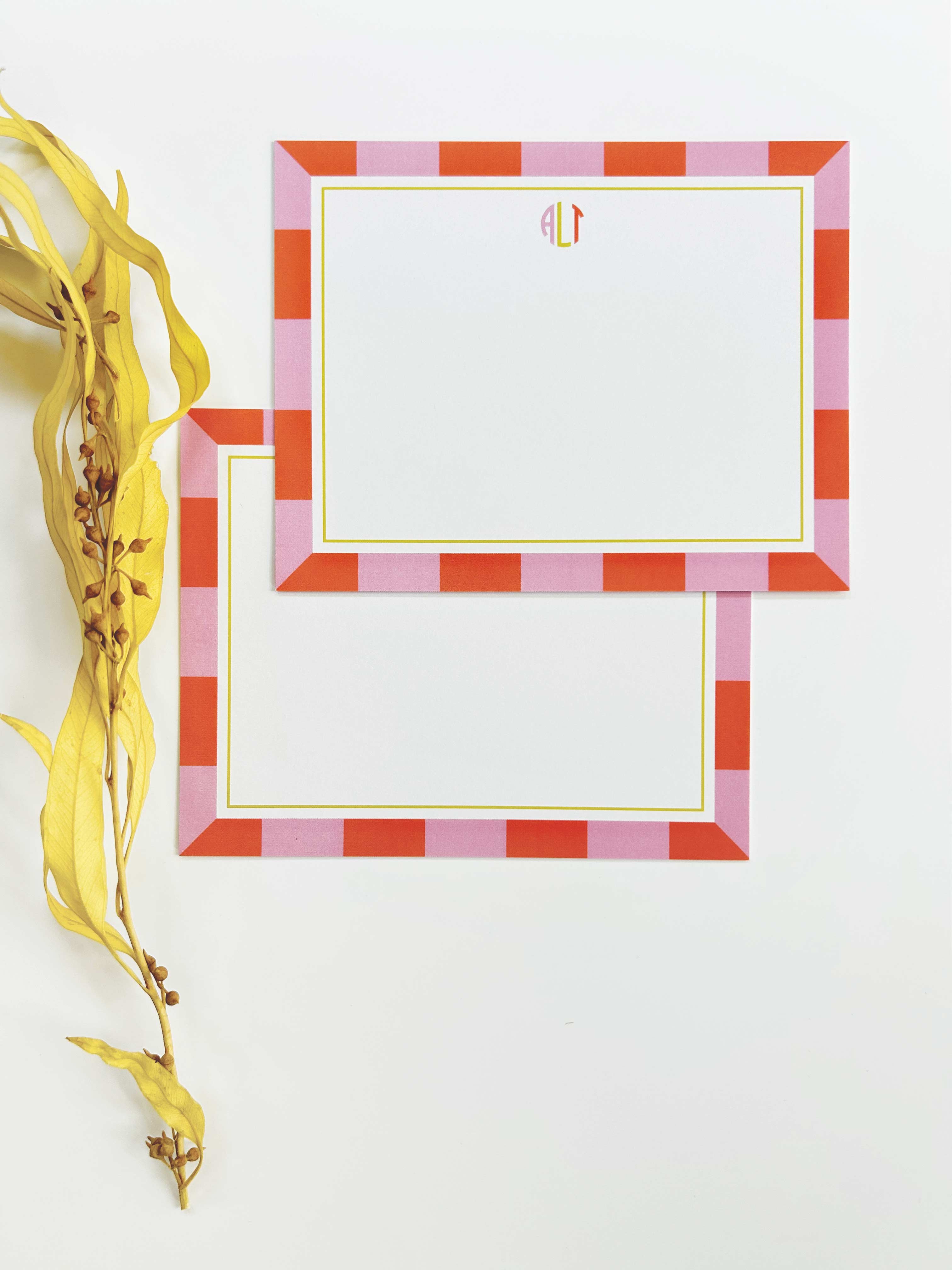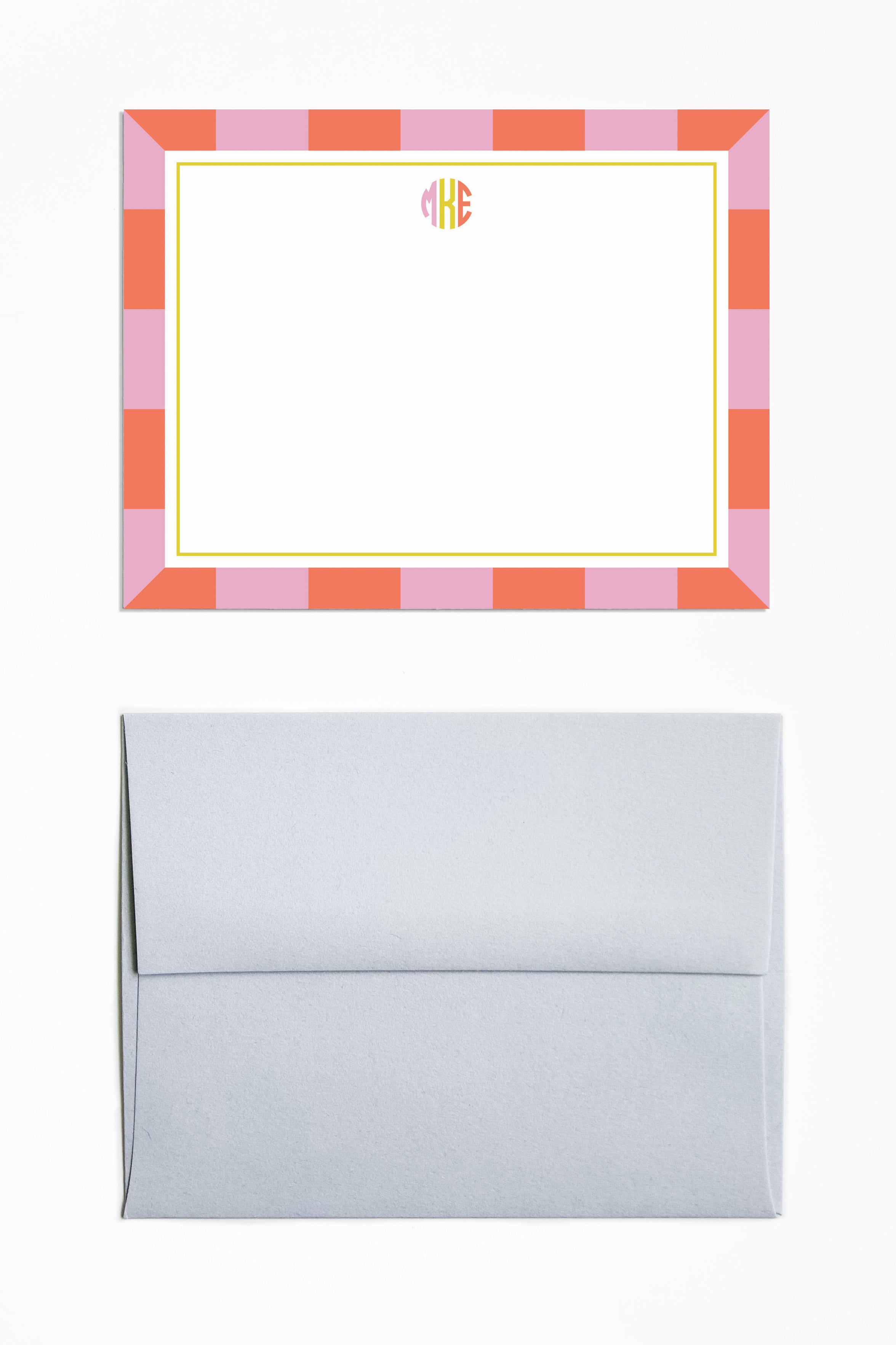 The Margot is a chic personalized stationery set, featuring a funky blend of lilac, coral, and gold hues. Geometric and whimsical, it is the perfect stationery for adding a touch of sophistication and charm to any correspondence.