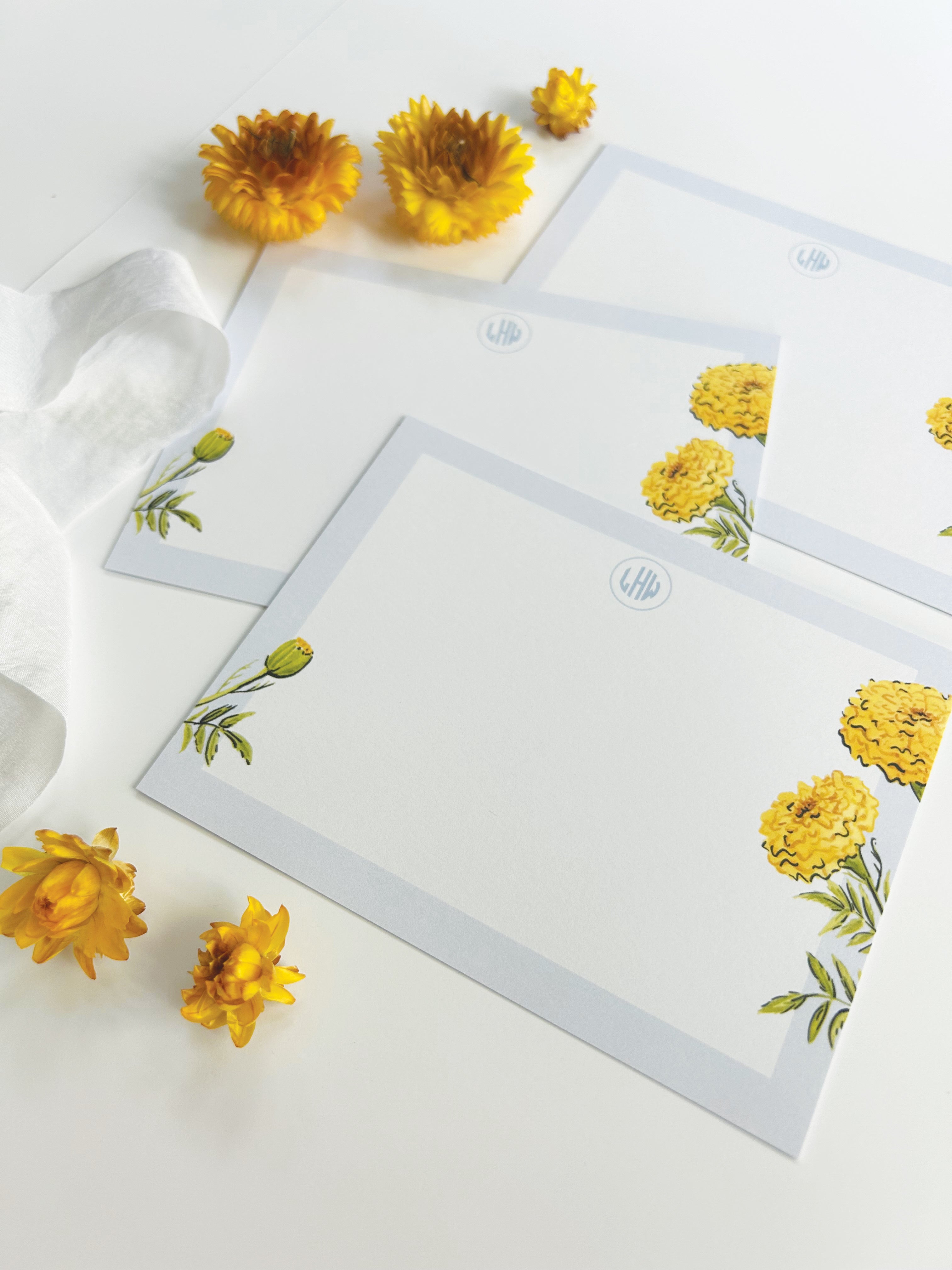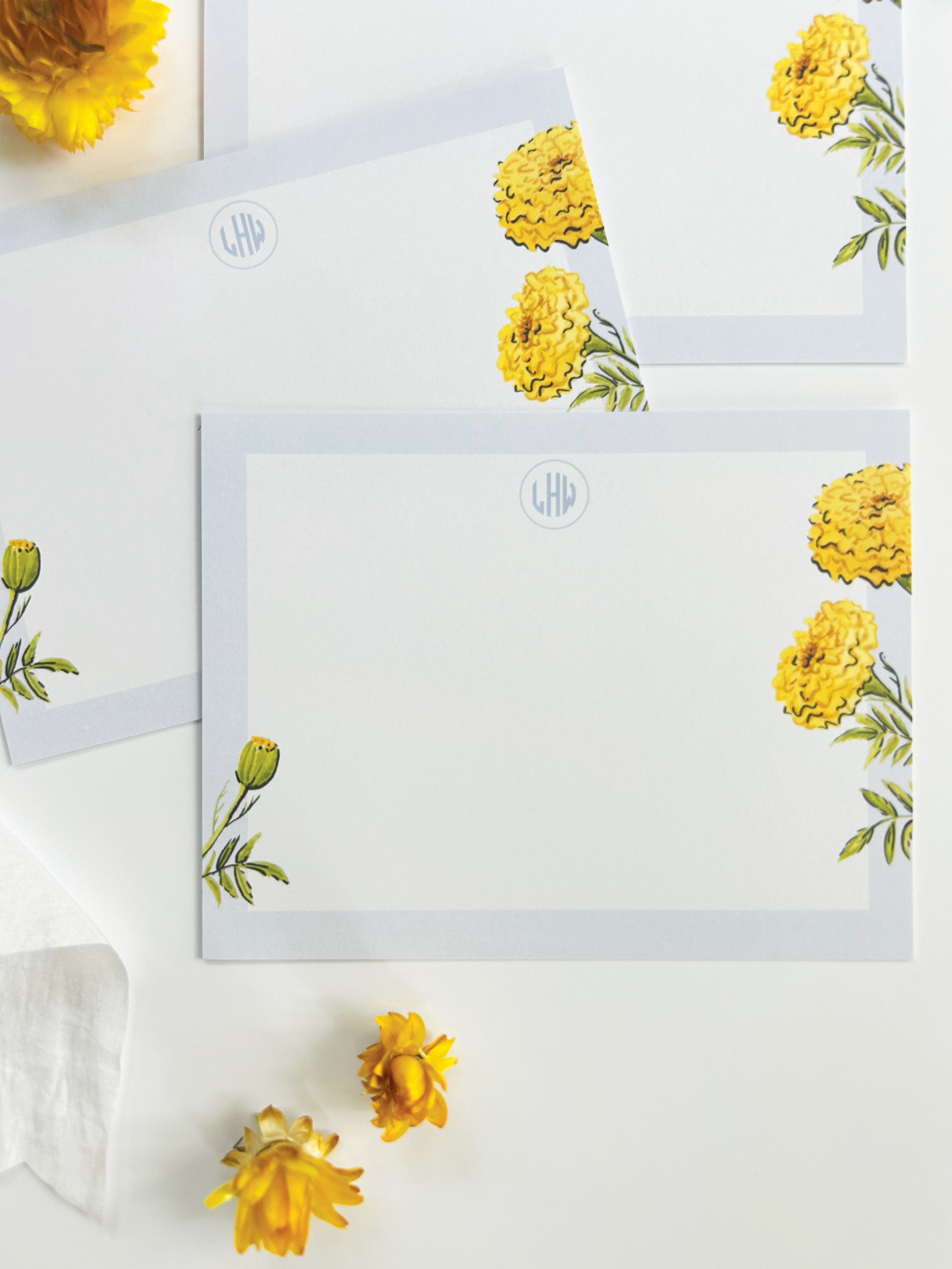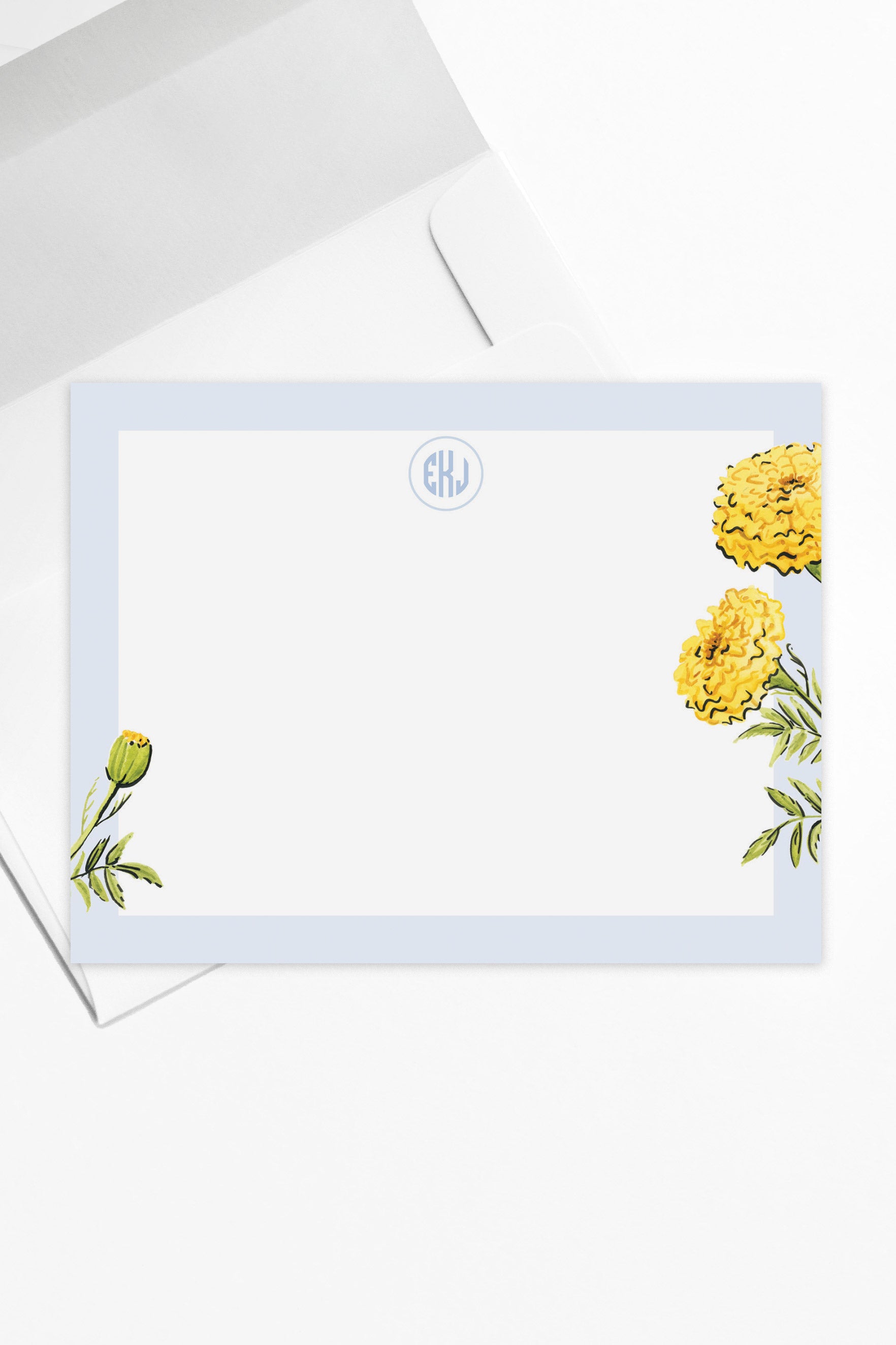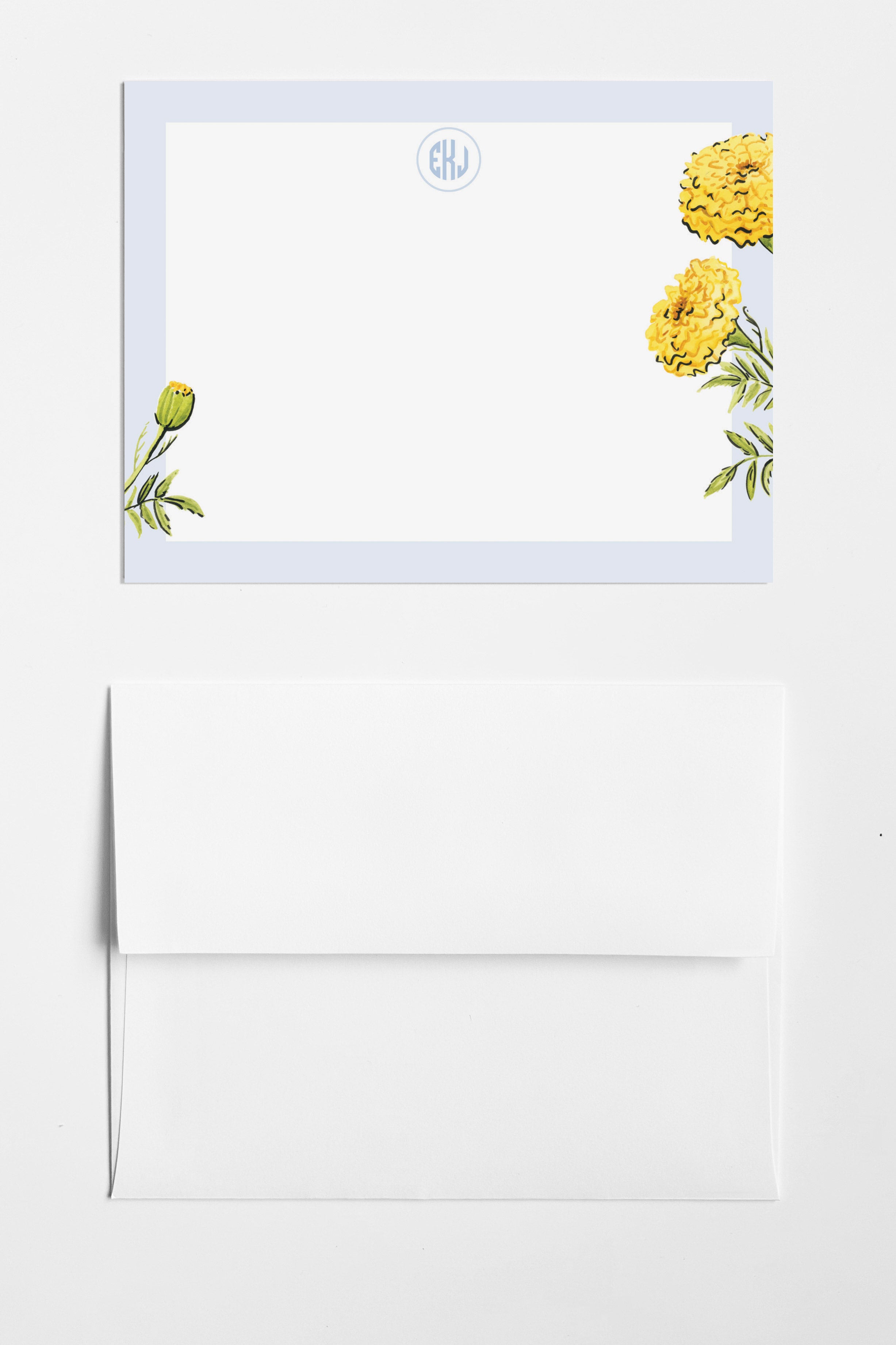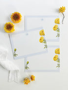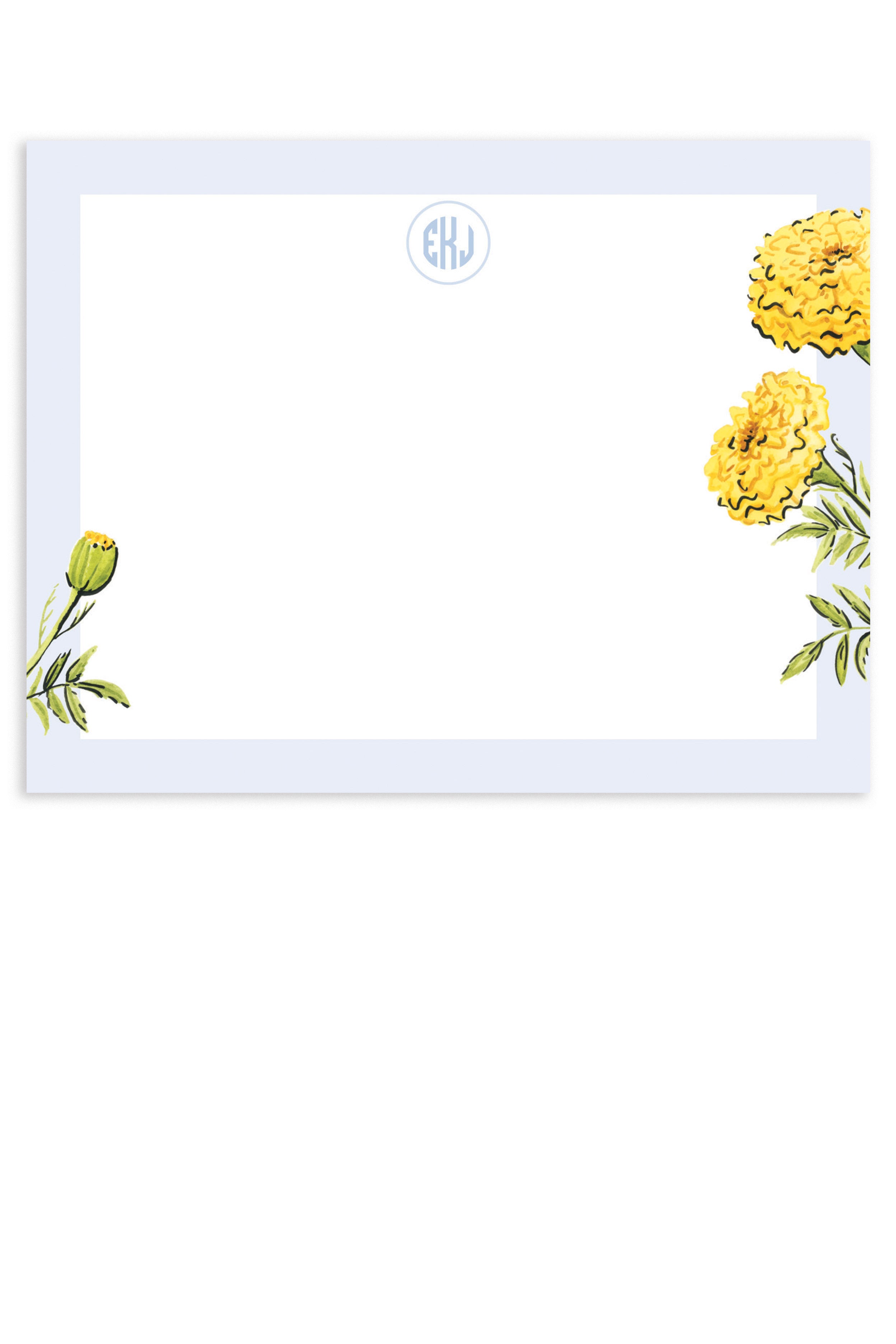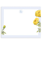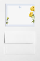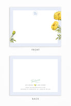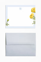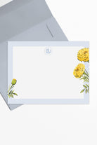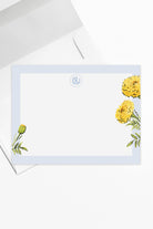 The Marigold stationery features watercolor marigolds with a crisp blue border, offering a vibrant yet sophisticated design that exudes a preppy charm. Perfect for adding a touch of elegance to your notes and letters.