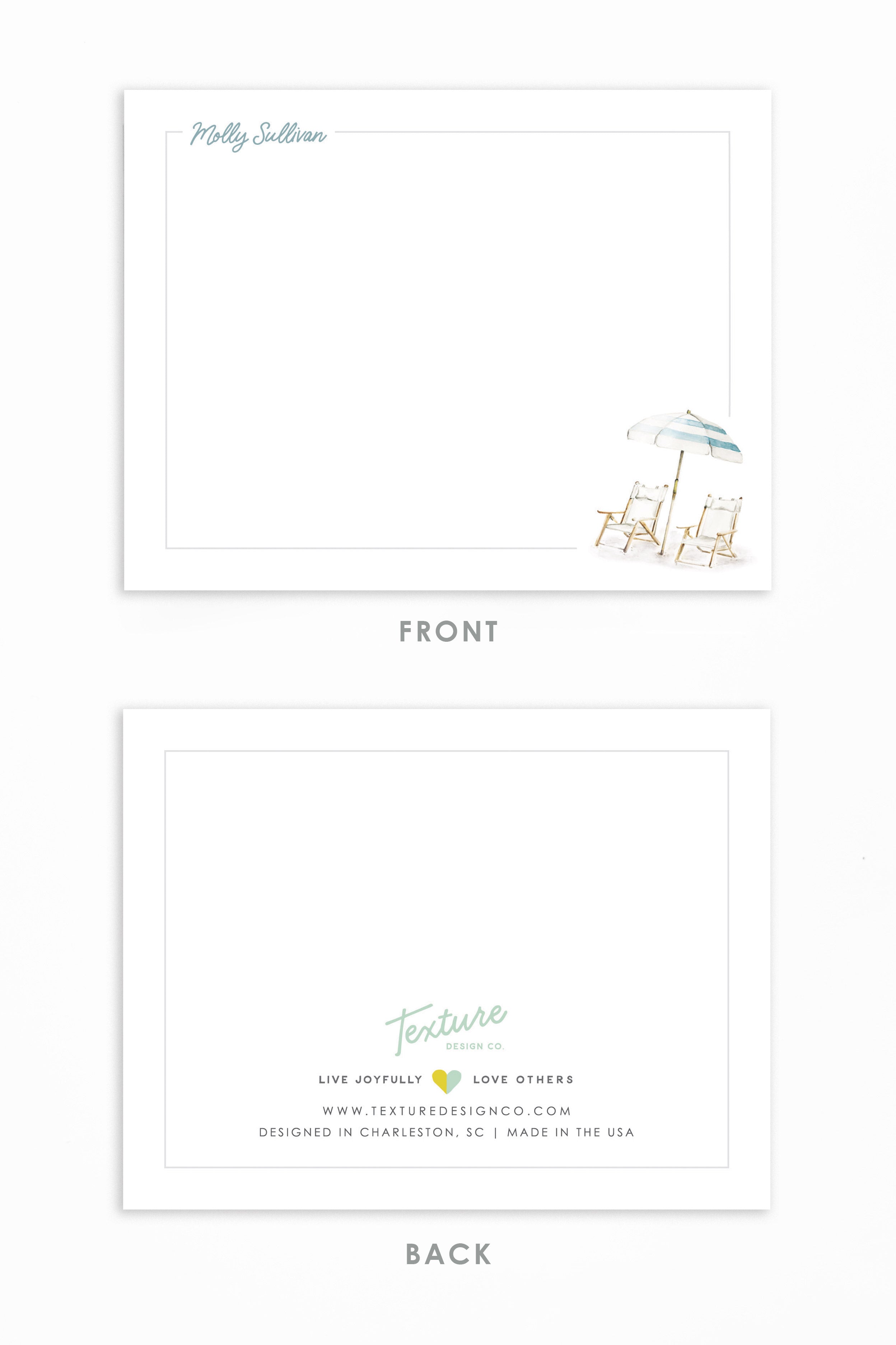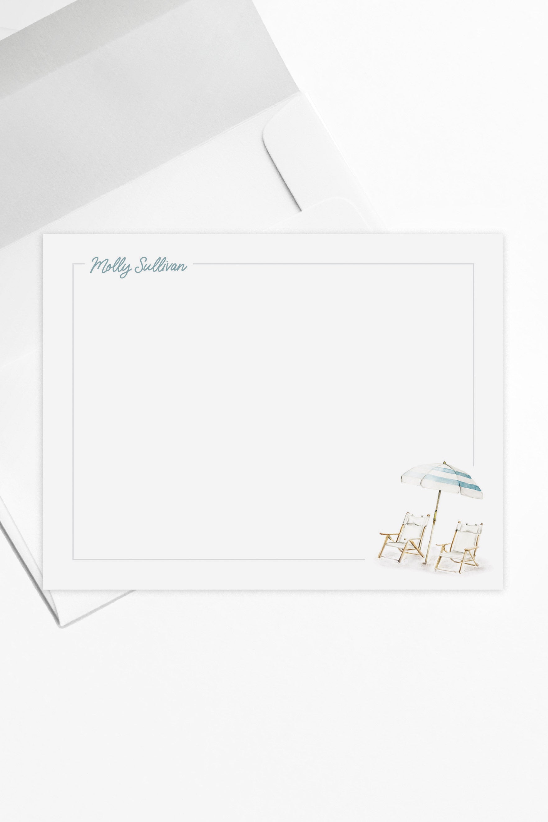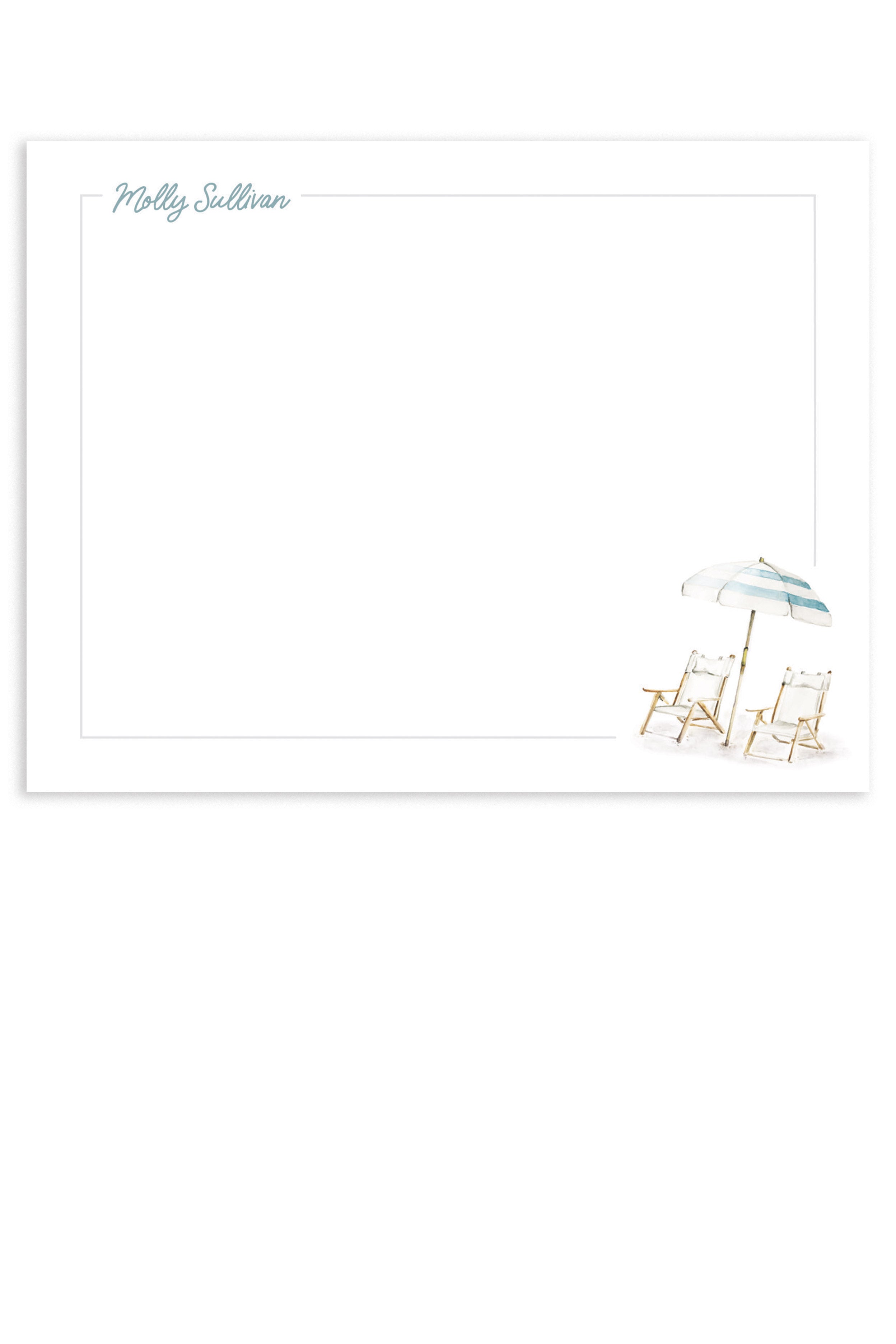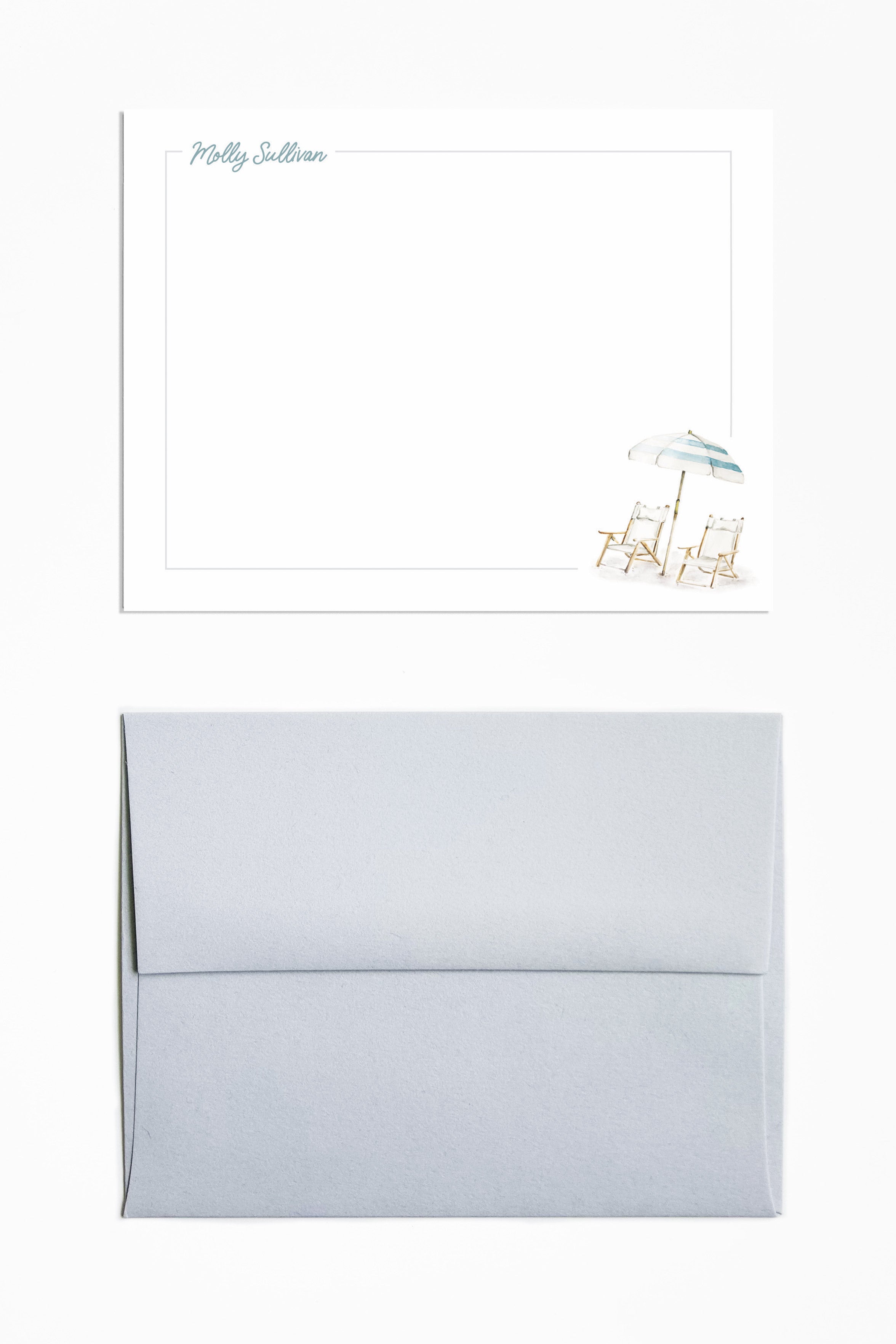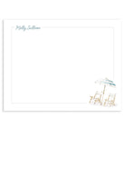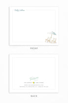 The Sullivan stationery captures the essence of coastal living with a serene watercolor scene of beach umbrellas and chairs, evoking a relaxed, beachy vibe. Ideal for sending sunny, seaside-inspired notes.