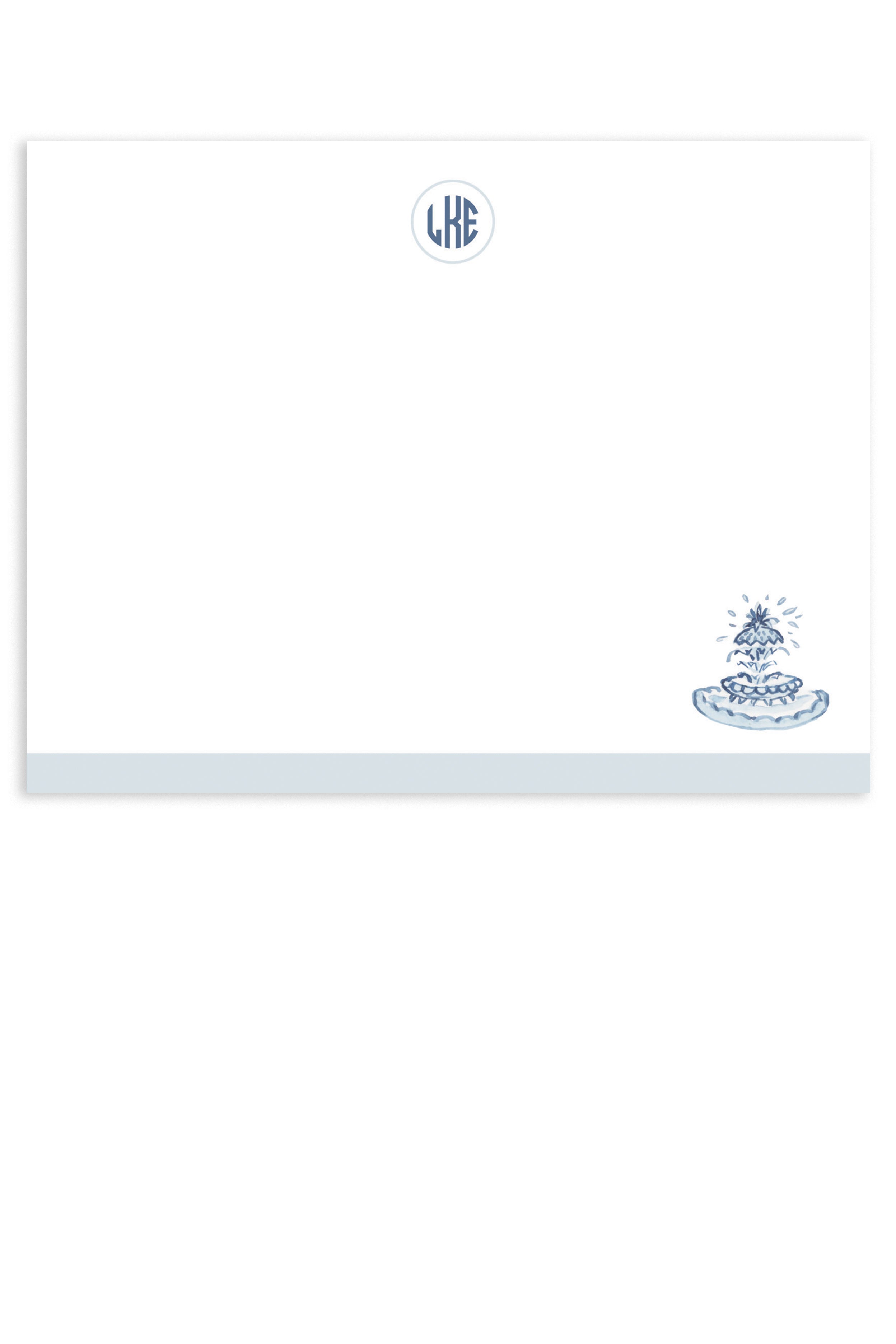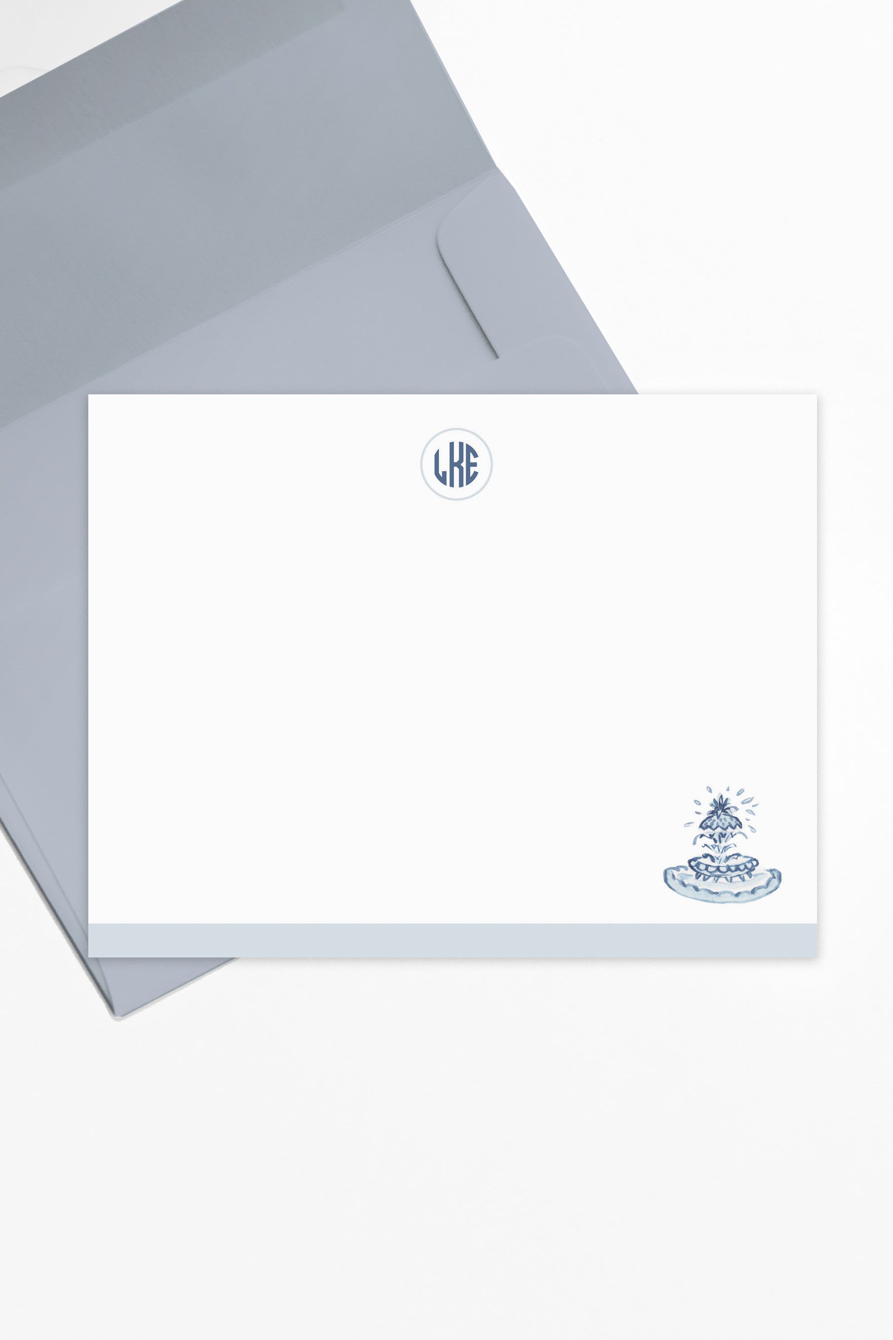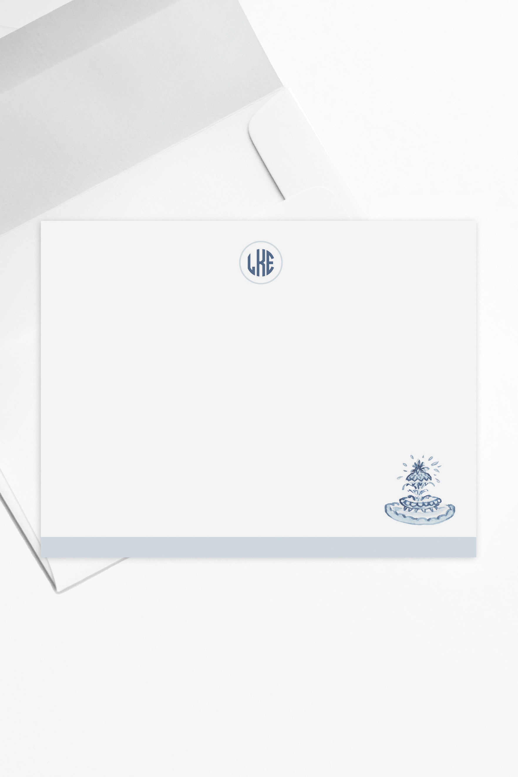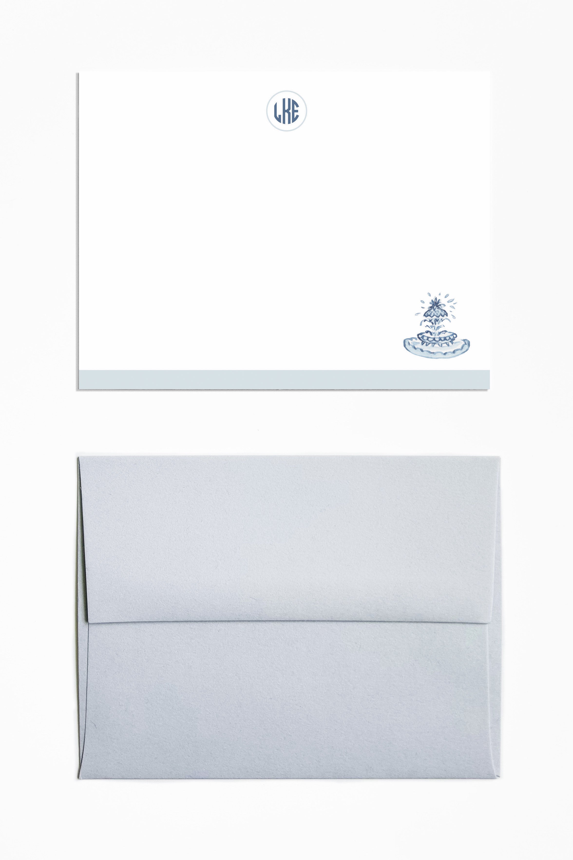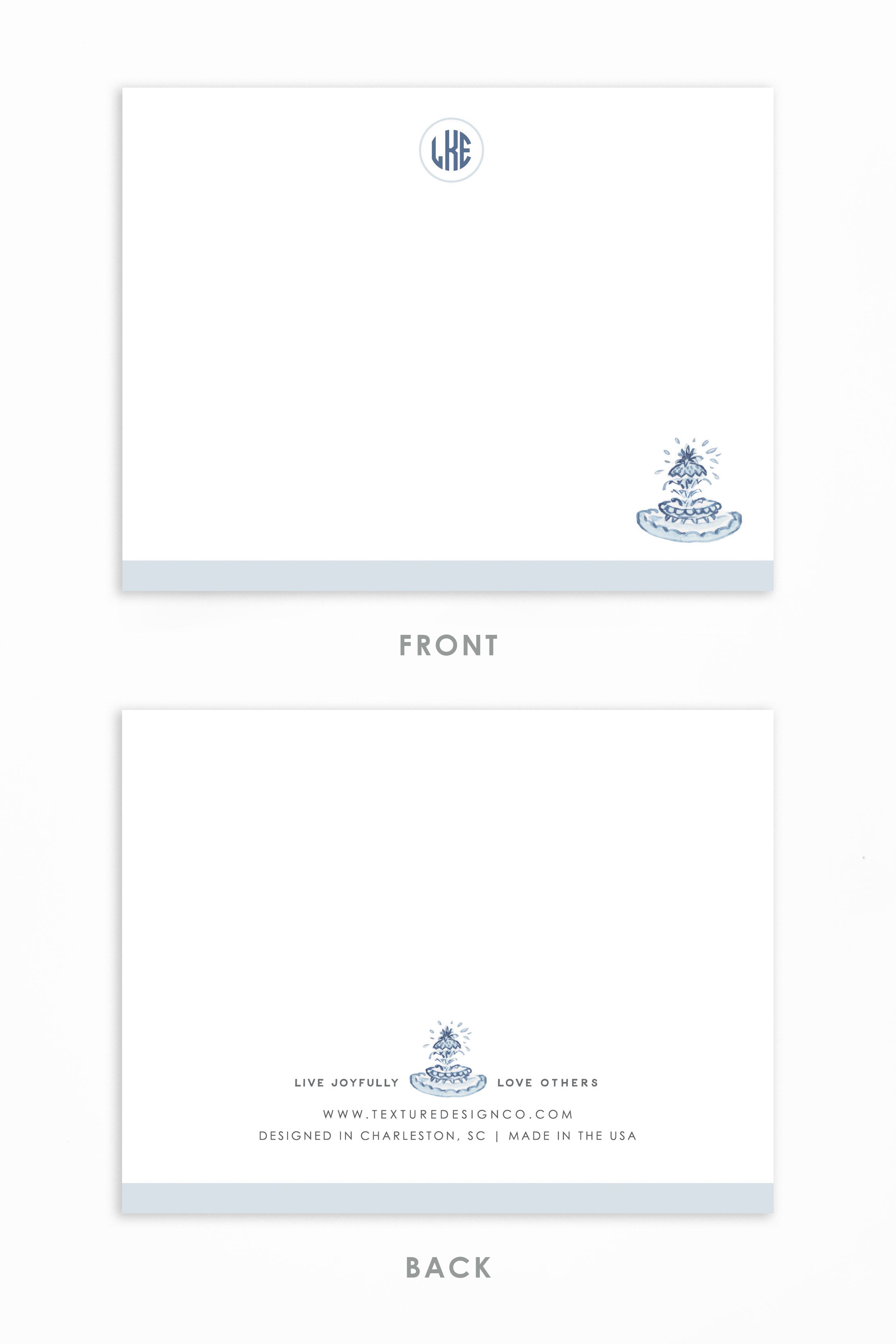 The Legare stationery features a watercolor illustration of Charleston’s iconic Pineapple Fountain, with soft blue tones that evoke Southern charm. The elegant monogram at the top adds a personal touch, making this set perfect for thoughtful notes or special correspondence. Embrace the timeless beauty of Charleston with this uniquely customized stationery.