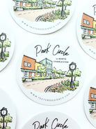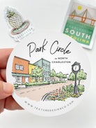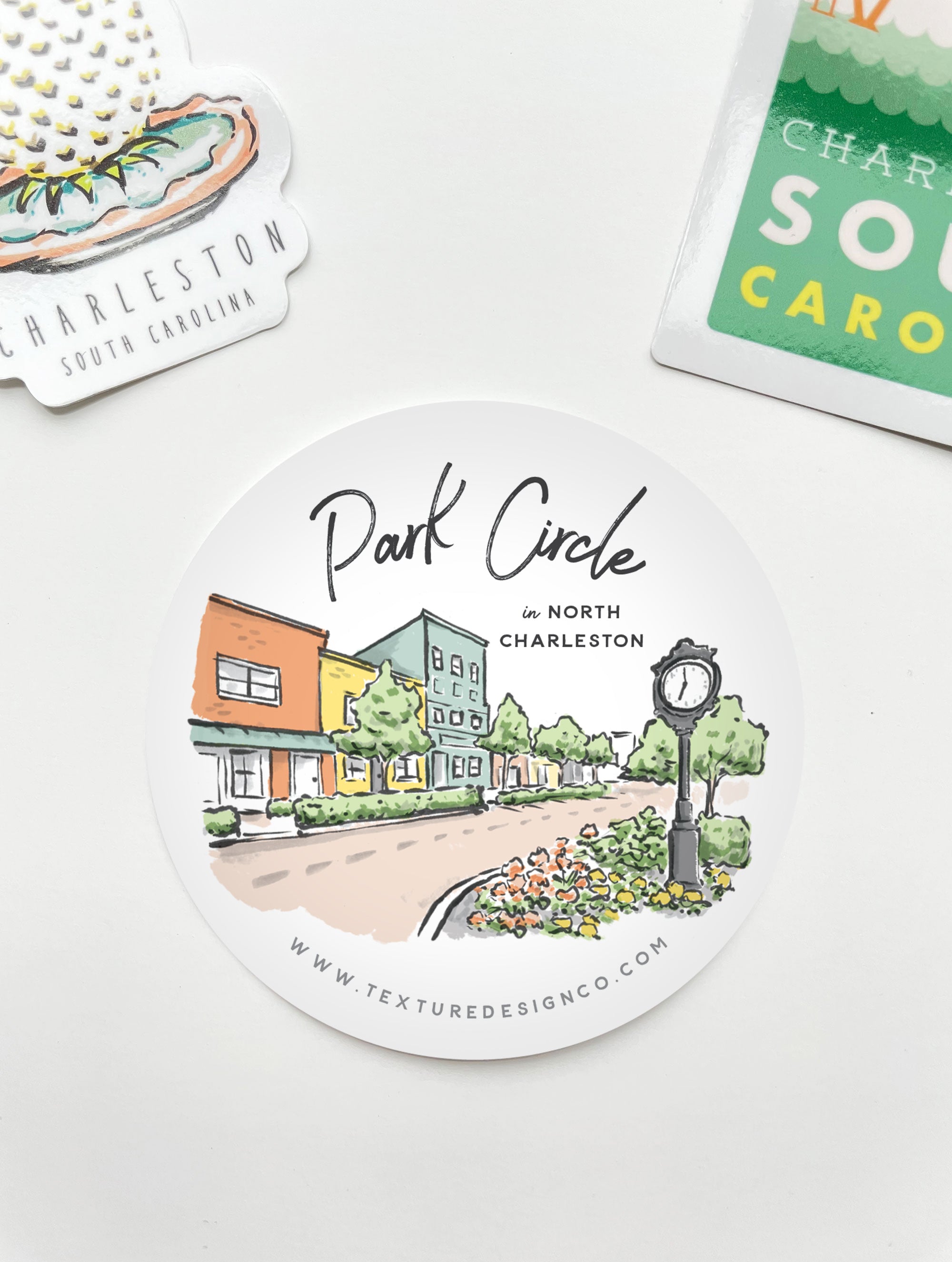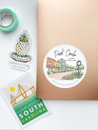 The Park Circle sticker includes a colorful scene of East Montague in downtown Park Circle. Cheerful and charming, use this sticker to commemorate a Park Circle trip or gift to a friend.