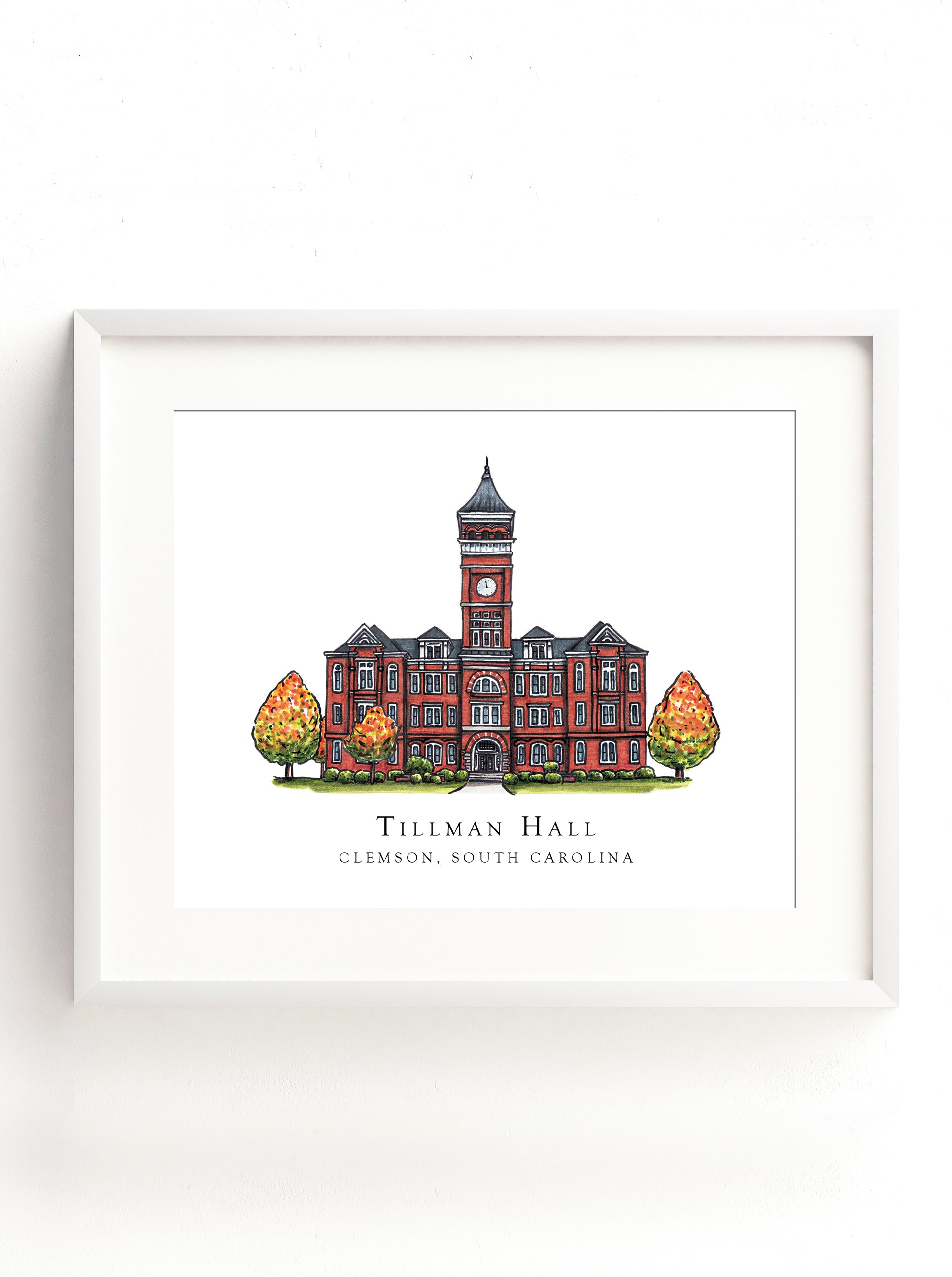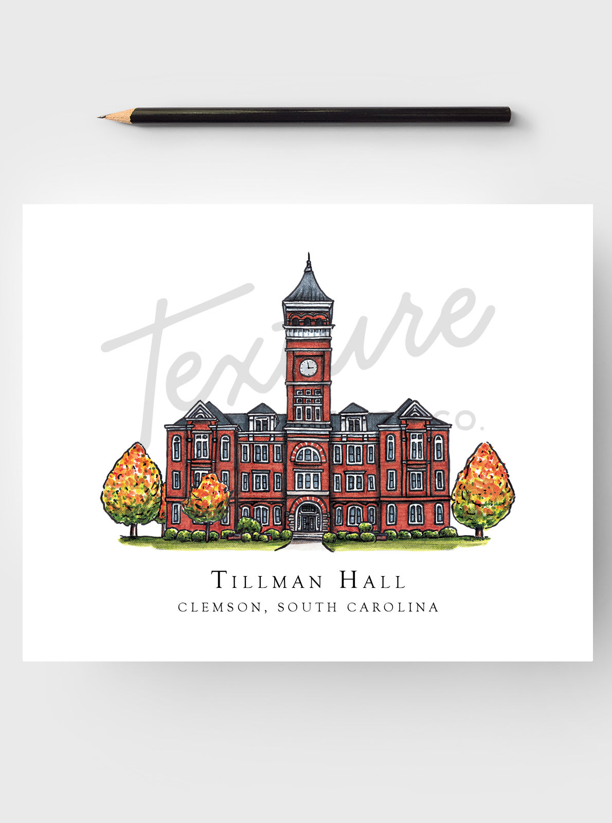 Art print of Tillman Hall in Clemson, South Carolina. Illustration hand-sketched by Texture Design Co owner, Emily Kirby.