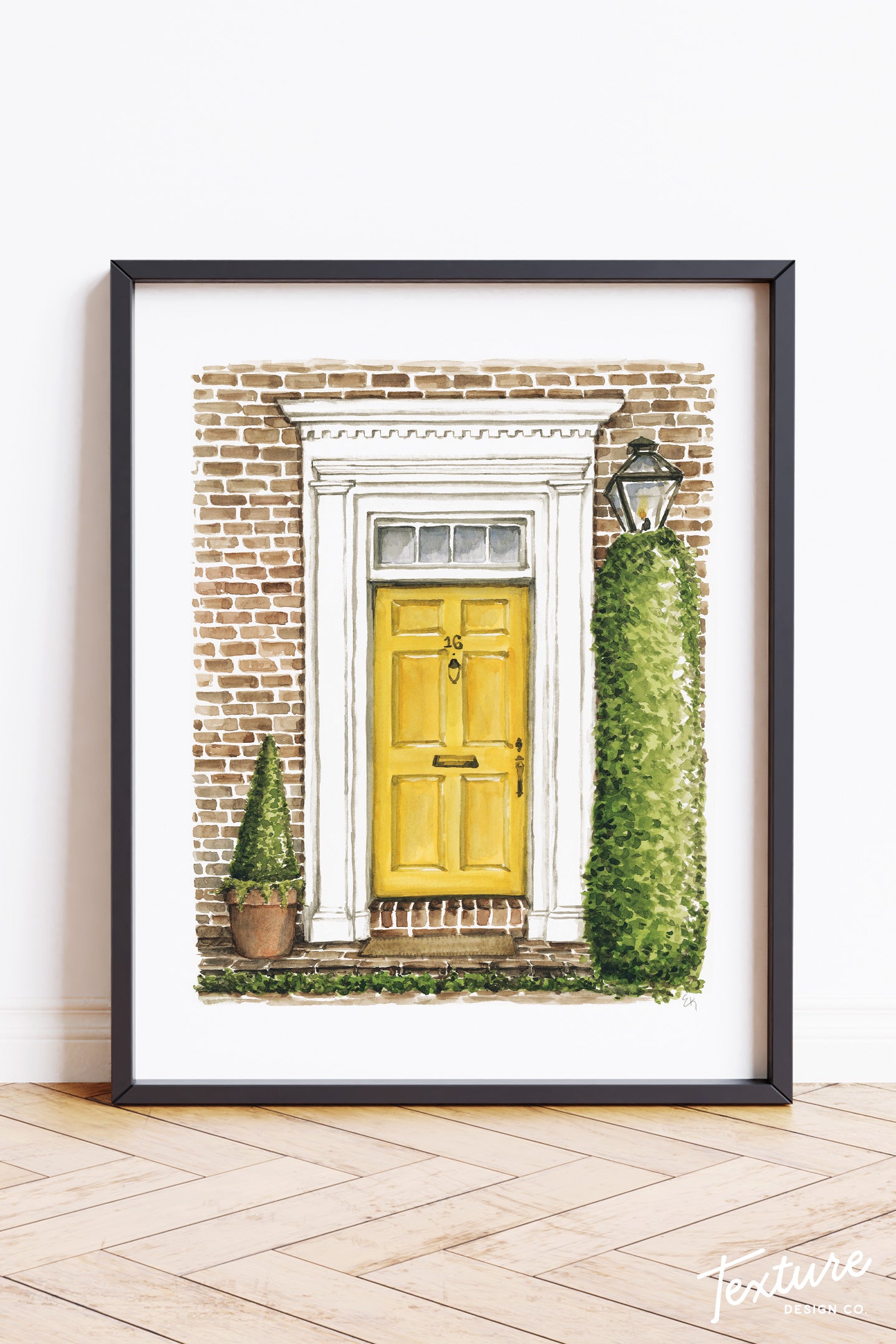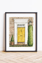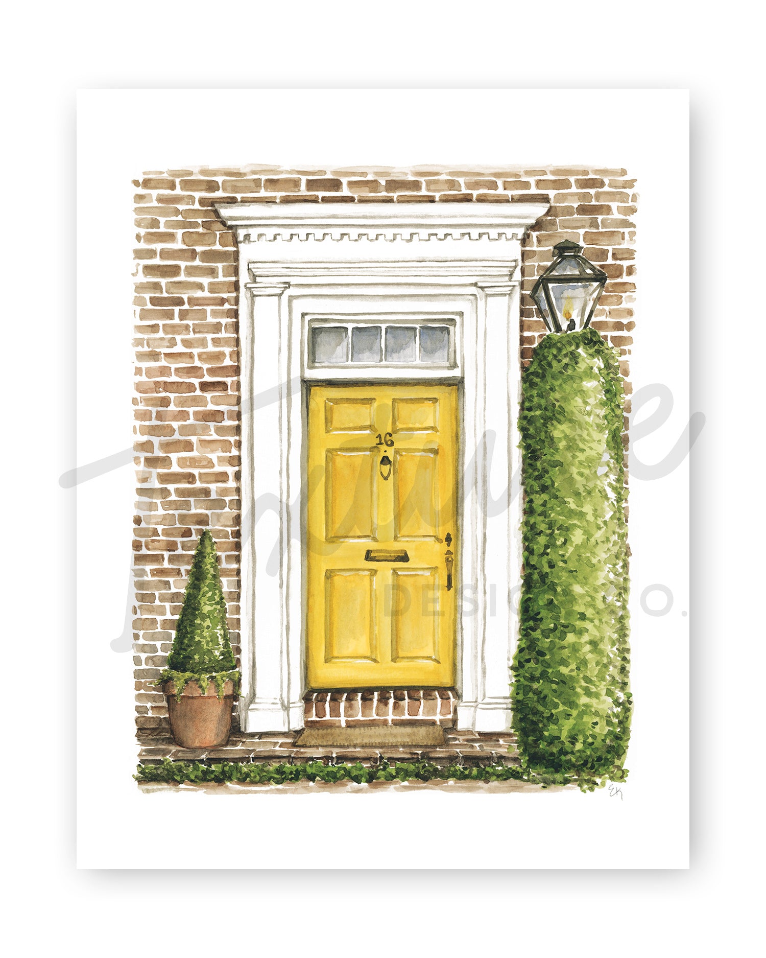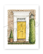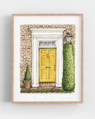 Inspired by the architectural design of the Lowcountry, the art print showcases an intricately detailed timeless front door from Charleston, SC. The intricate tooth molding frames the marigold door creating a vibrant centerpiece against the colonial brick home.