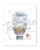 Art print features a watercolor painting of a Charleston, SC flower box.