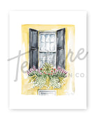 Art print features a watercolor painting of a Charleston, SC flower box.