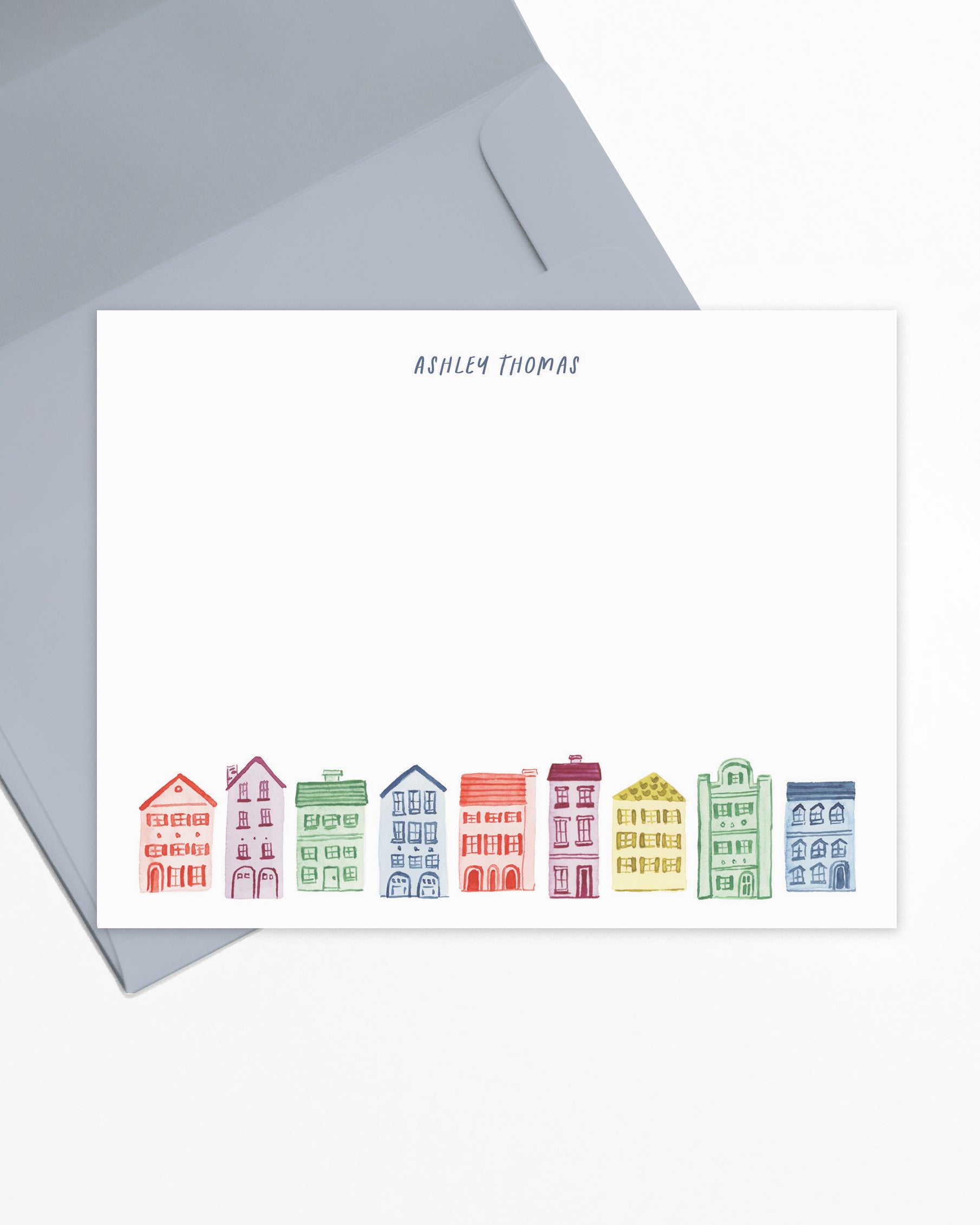 The Margot is a chic personalized stationery set, featuring a funky blend of lilac, coral, and gold hues. Geometric and whimsical, it is the perfect stationery for adding a touch of sophistication and charm to any correspondence.