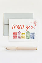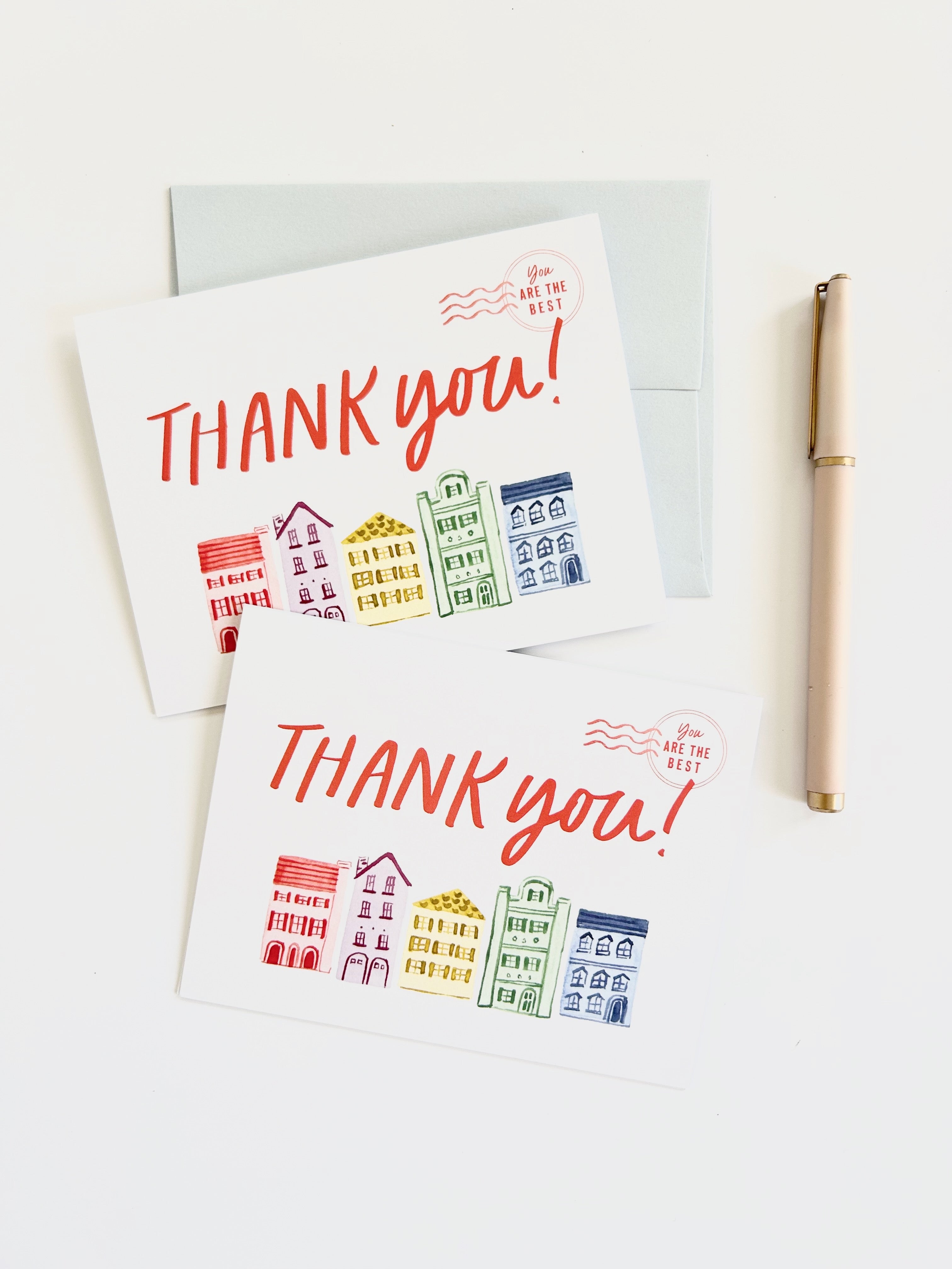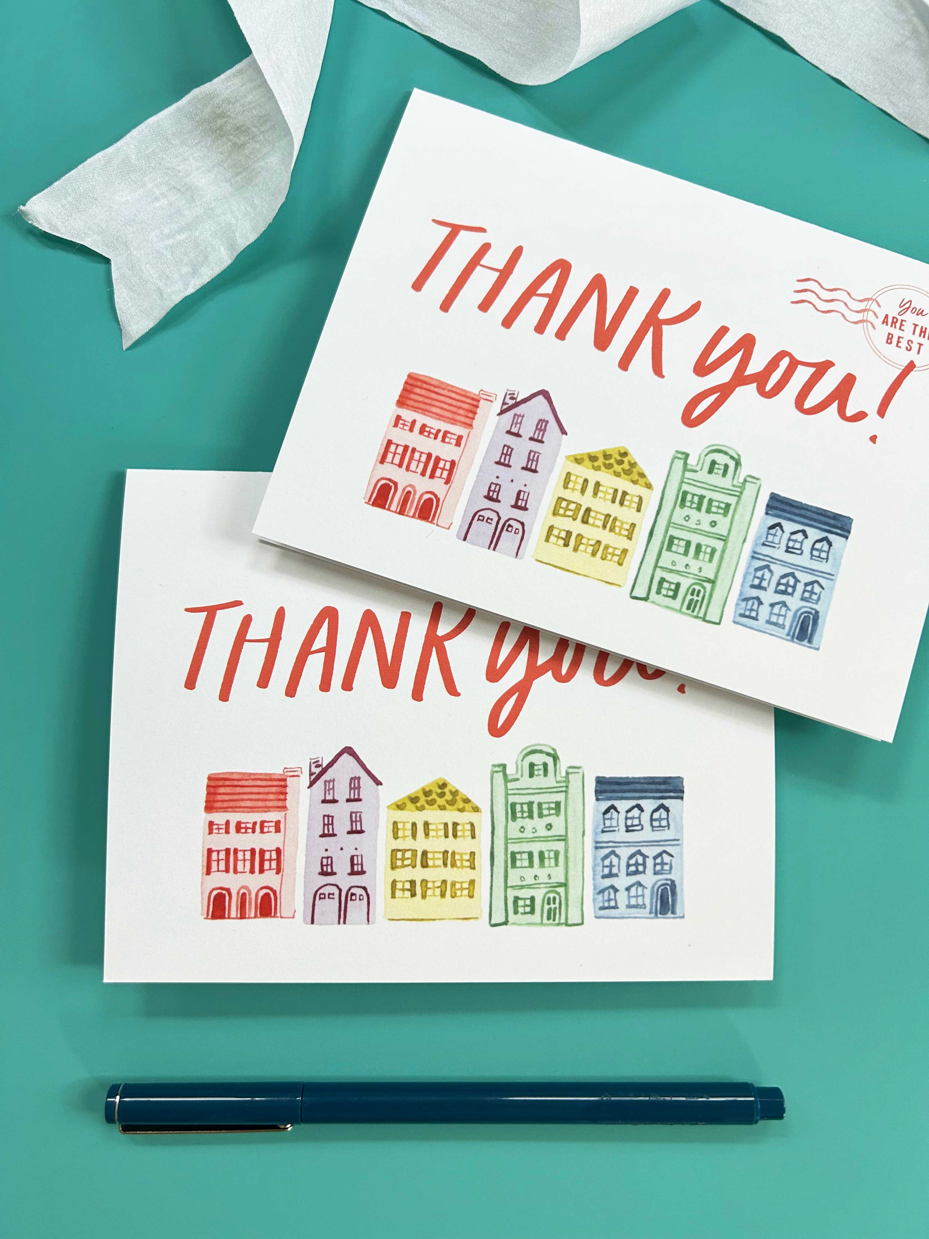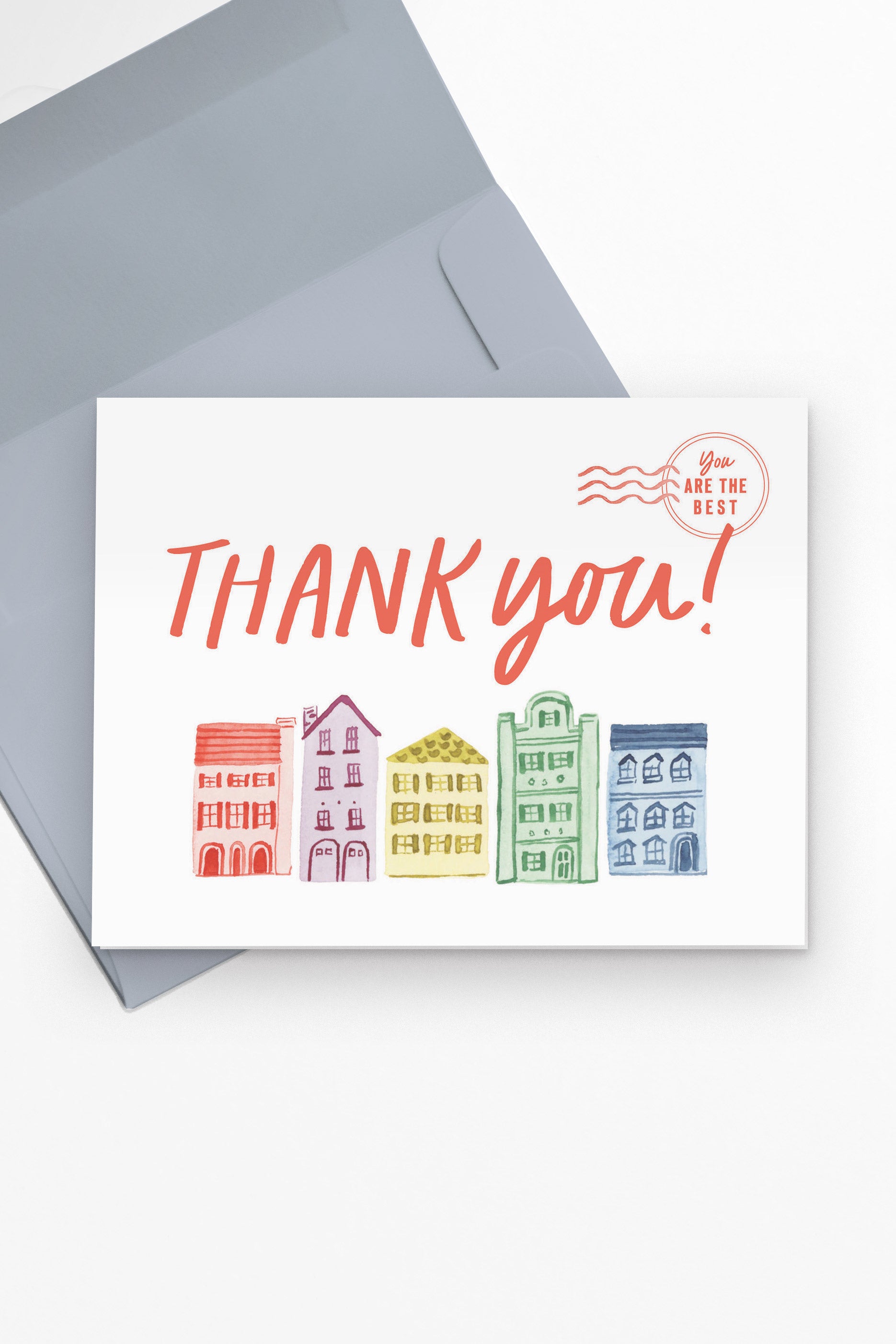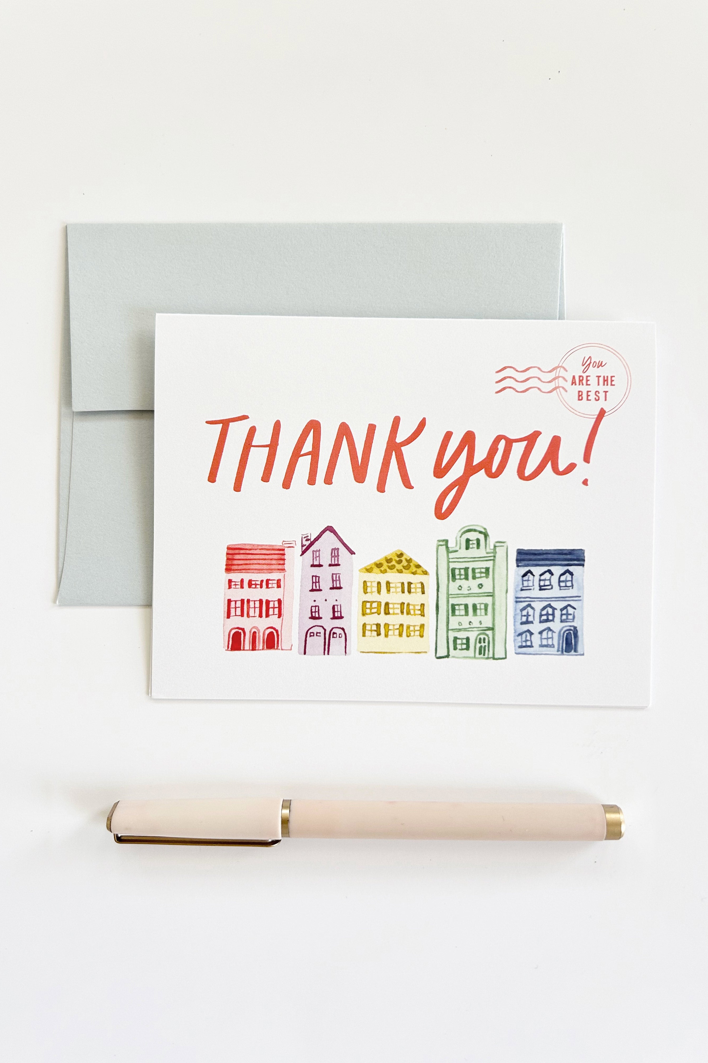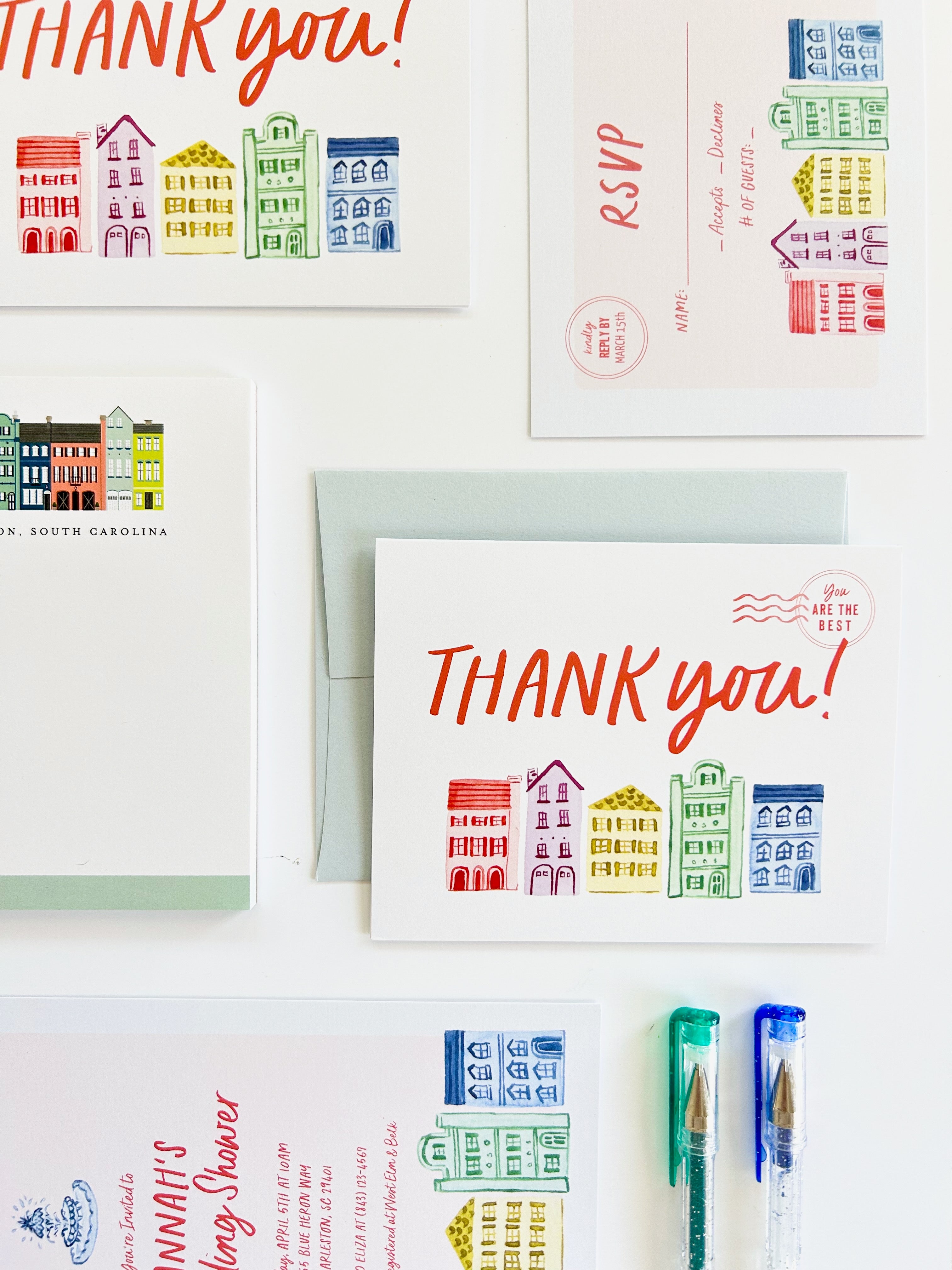 The Rainbow Row Thank You card features the cutest little watercolor row houses inspired by Charleston's iconic Rainbow Row. Send your thank-you's with color and charm!