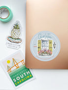 The circular Charleston Flower Box sticker in Blue showcases a classic Charleston flower box, bursting with colorful blooms overlayed on a blue-gray background. The heavy duty sticker is perfect for decorating laptops, water bottles, or notebooks with a touch of Lowcountry elegance.